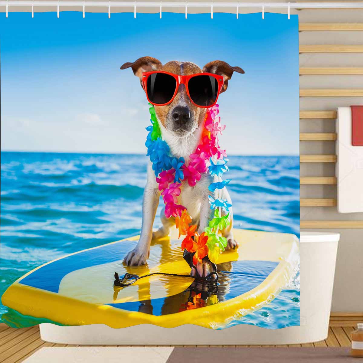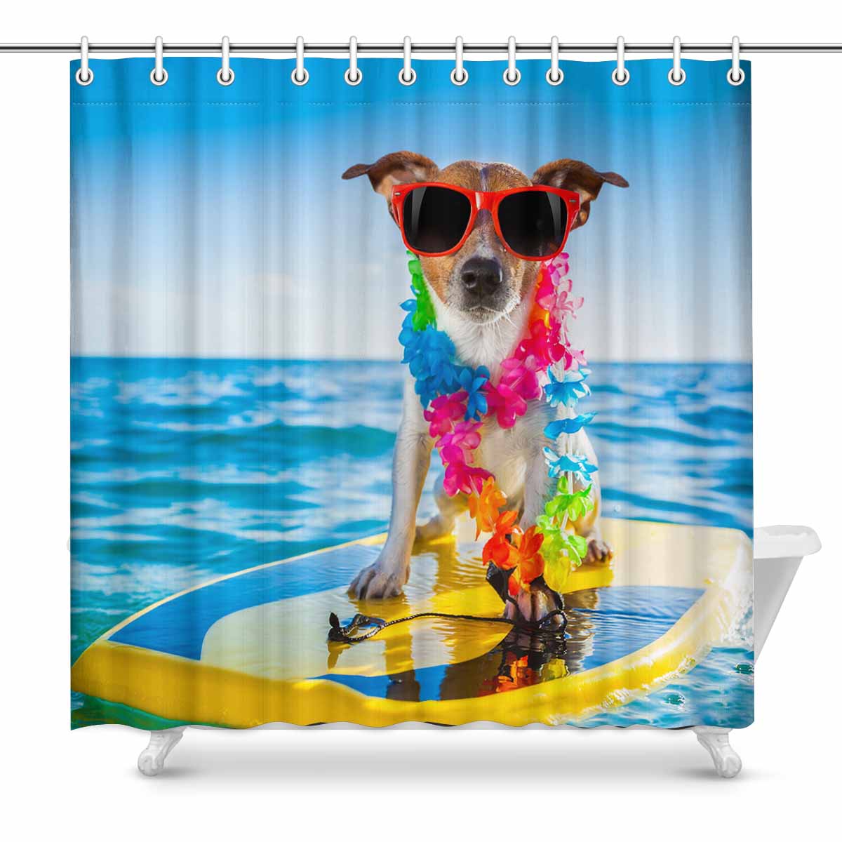 Tropical themed Shower Curtains dog surfing on a surfboard wearing a flower chain and sunglasses