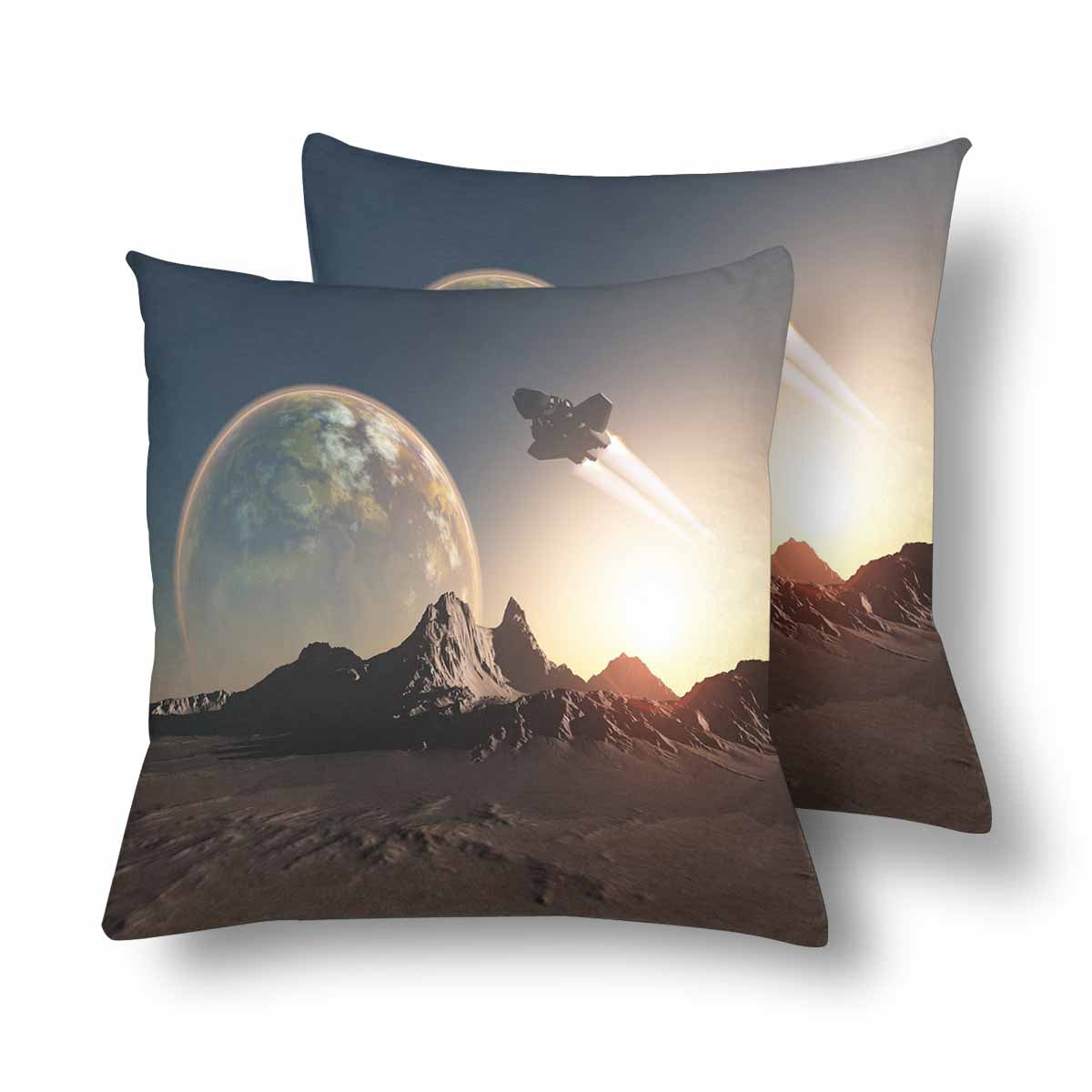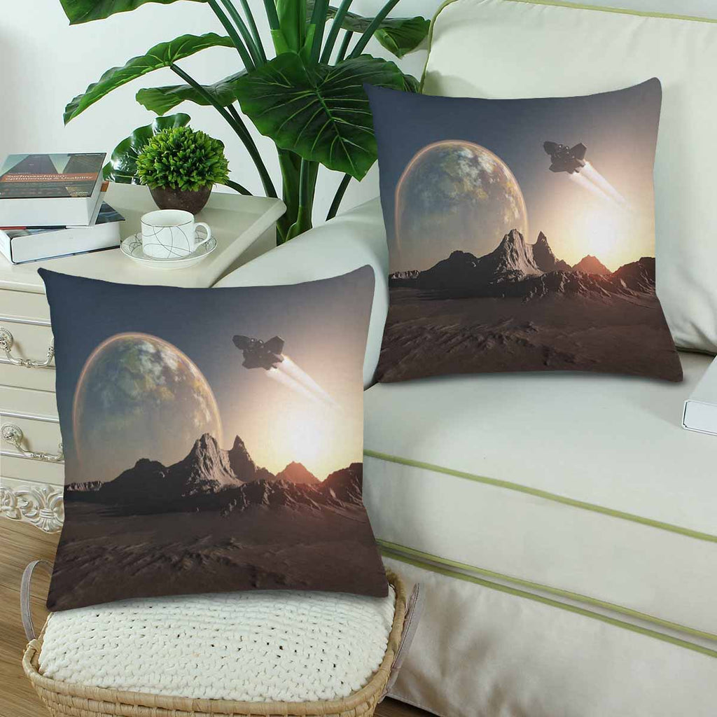 Galaxy themed Pillow Cases printed with Spacecraft over moutainous terrain of the planet