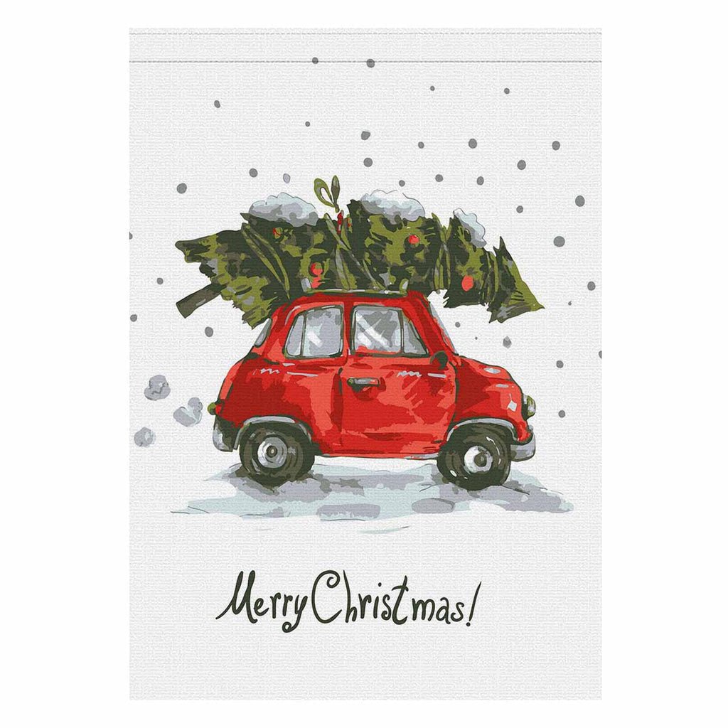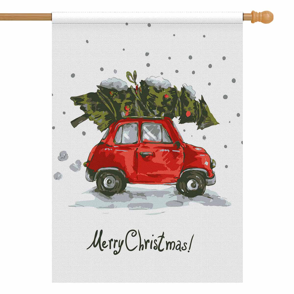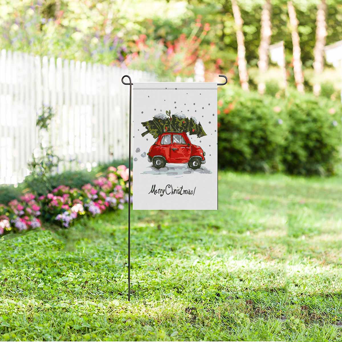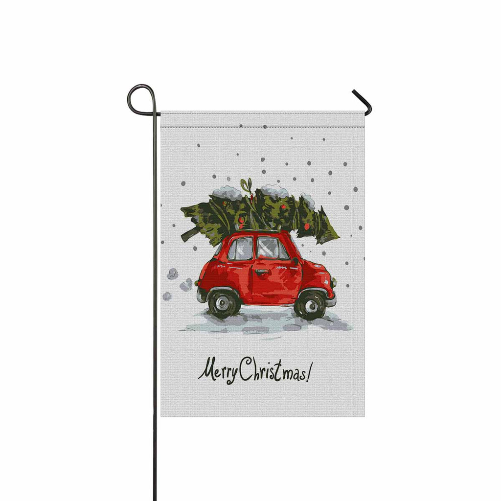 Garden Flags printed Christmas themed with Vintage vector Merry Christmas and Happy New Year illustration with red retro car, Christmas tree