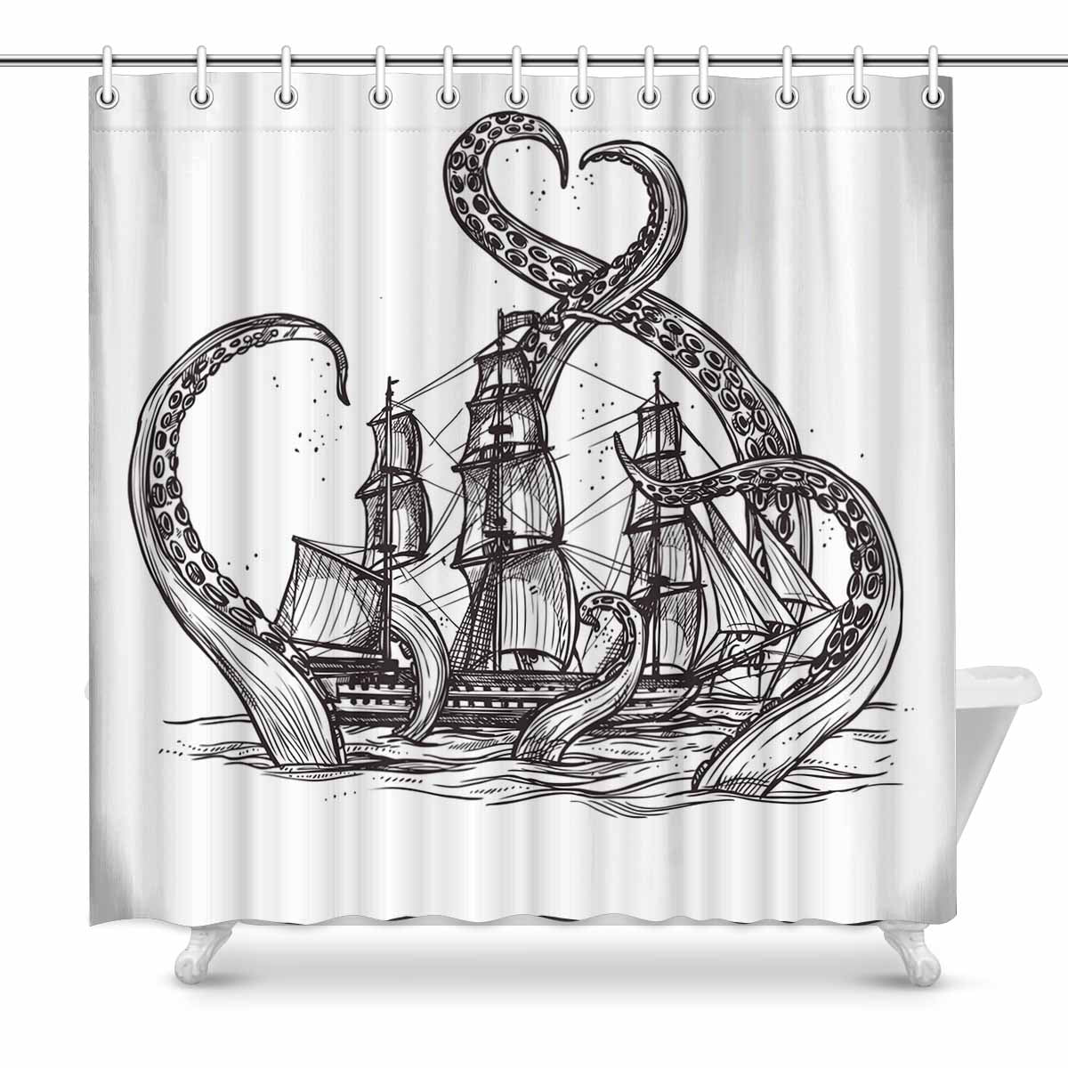 Shower Curtains print with Giant octopus catches old style sail ship vector illustration