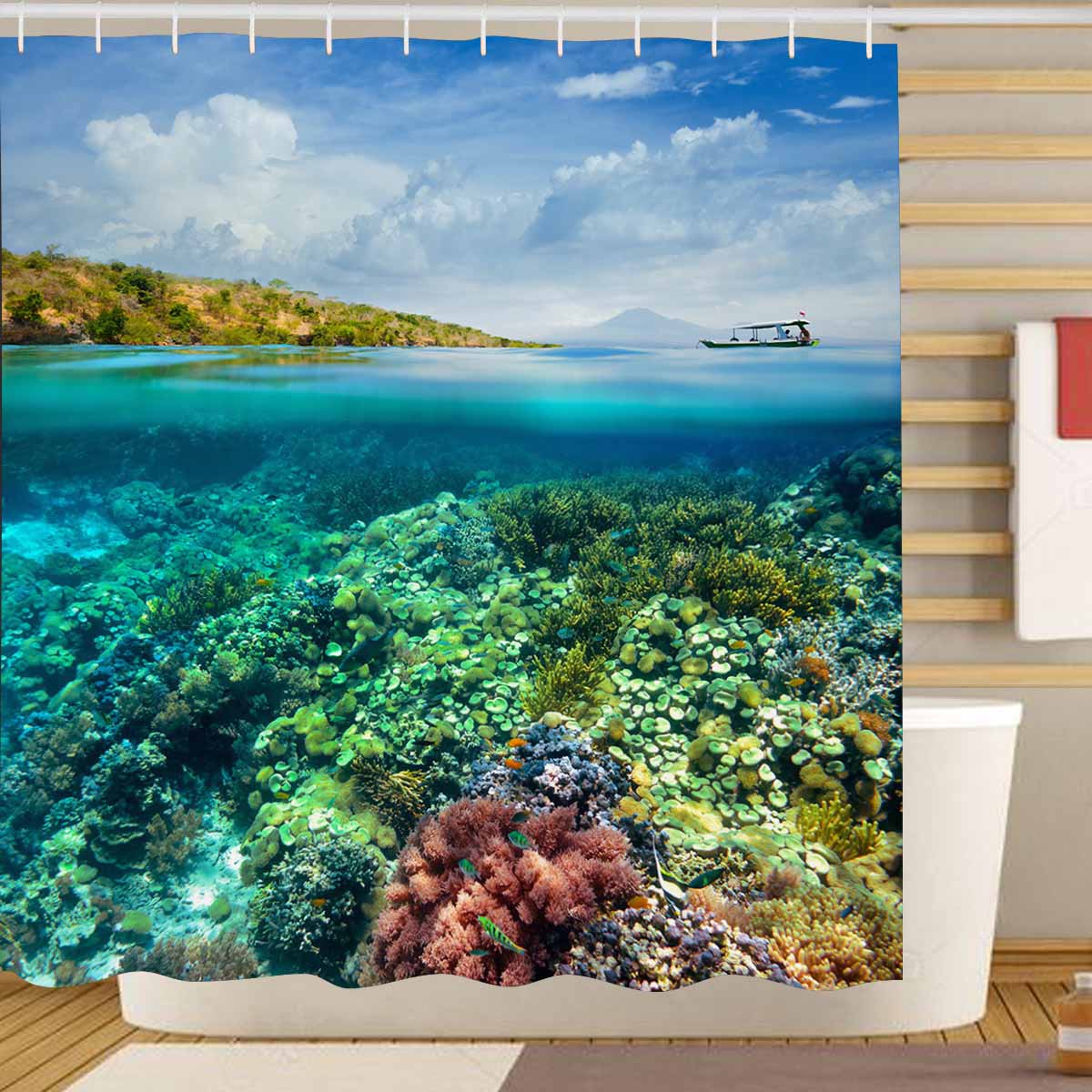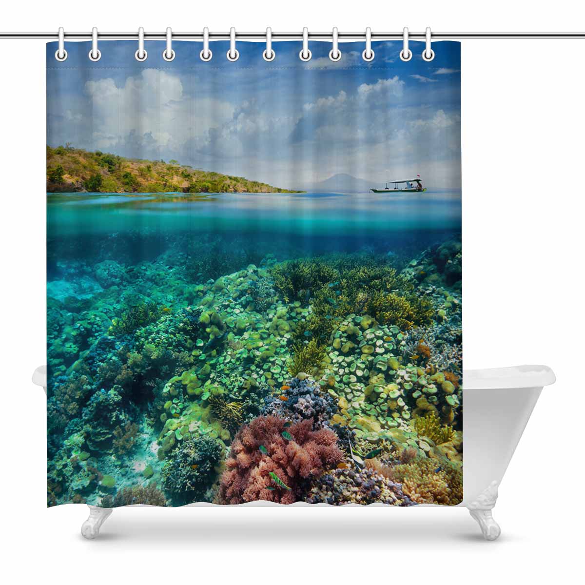 Shower Curtains print with Beautiful Coral reef and volcano