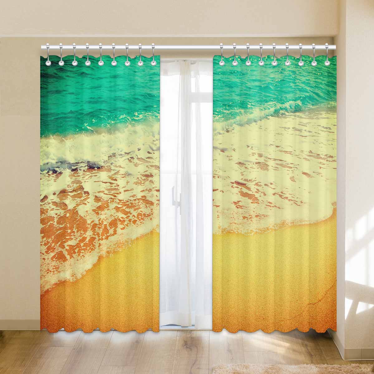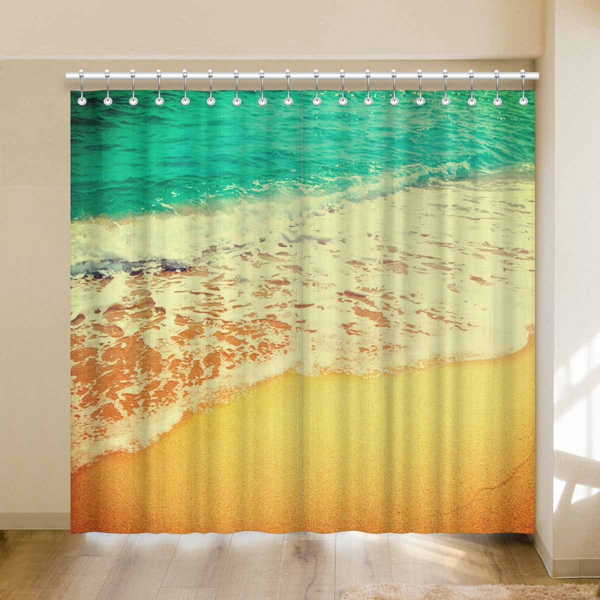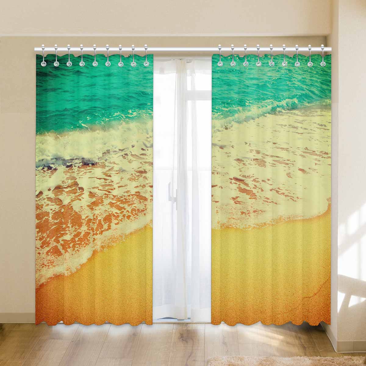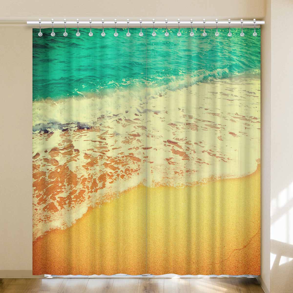 Window Curtains print Golden sand beach with waves