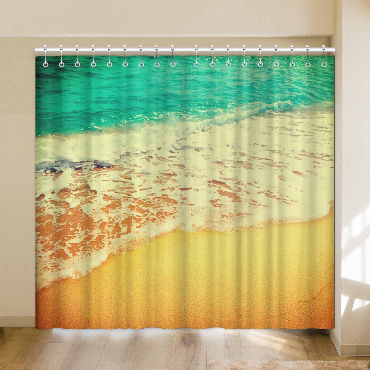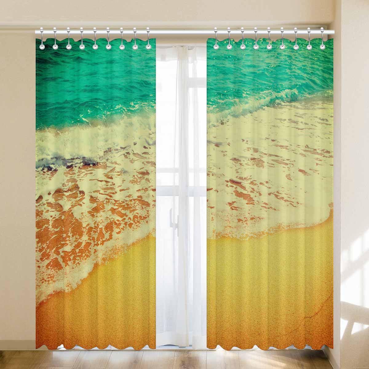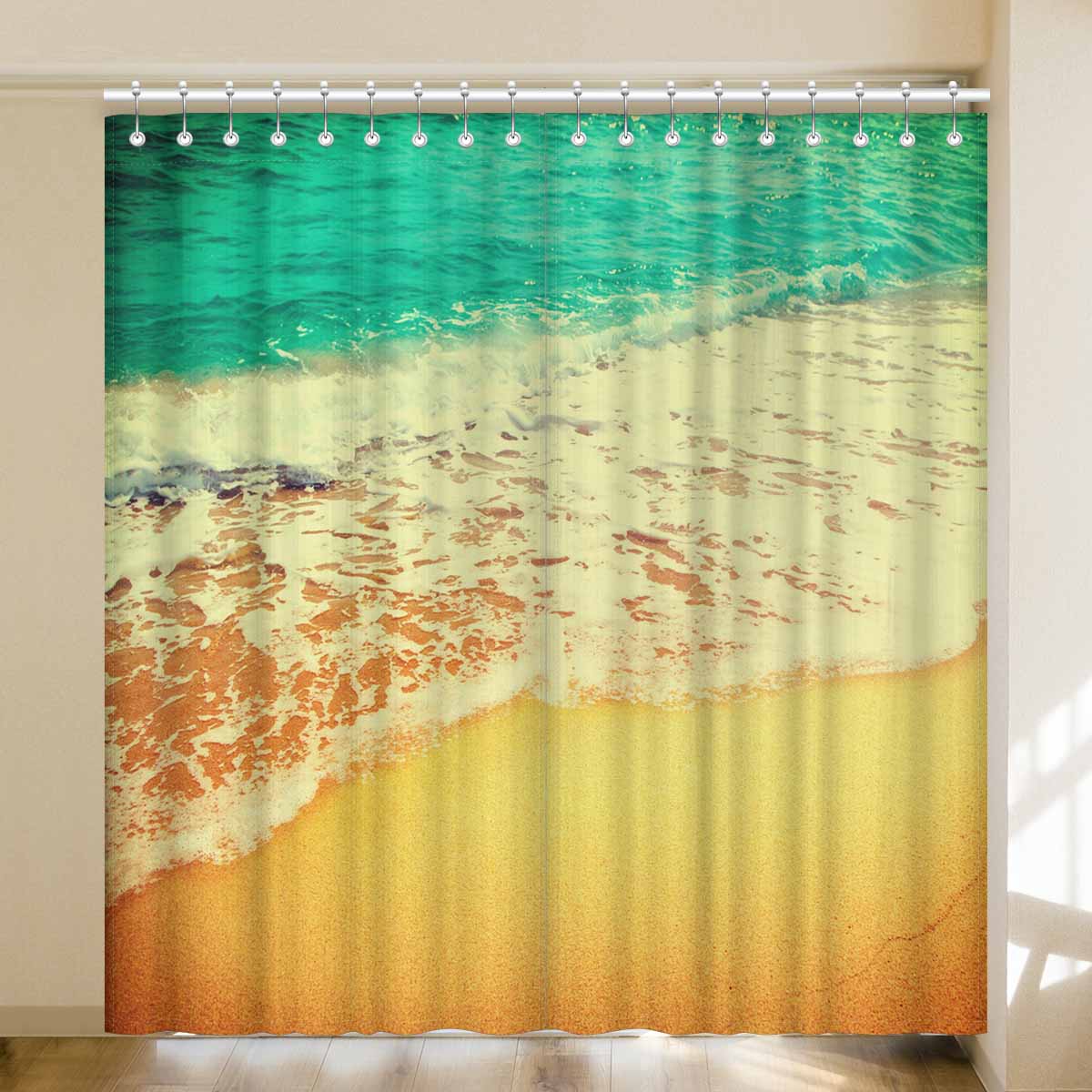 Window Curtains print Golden sand beach with waves