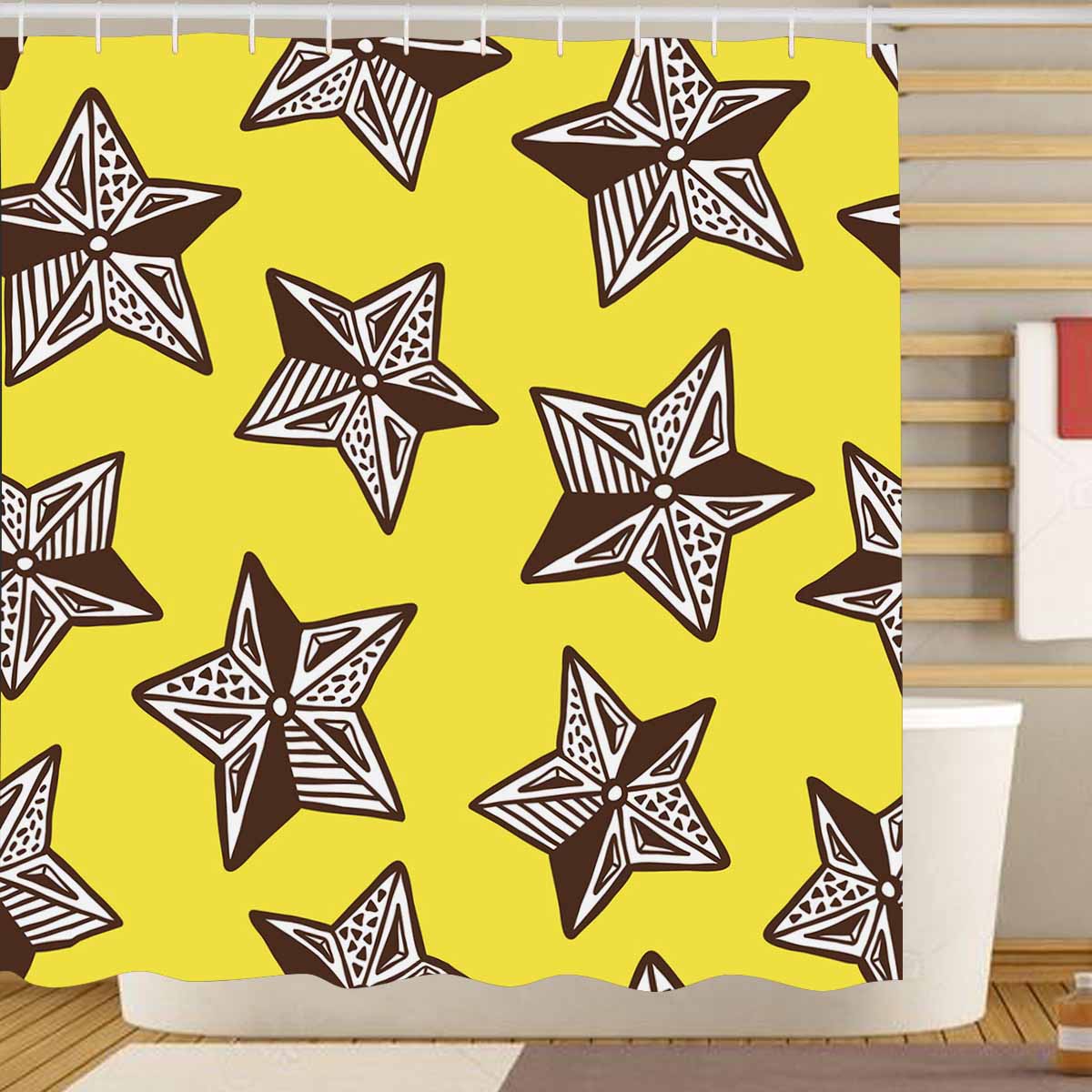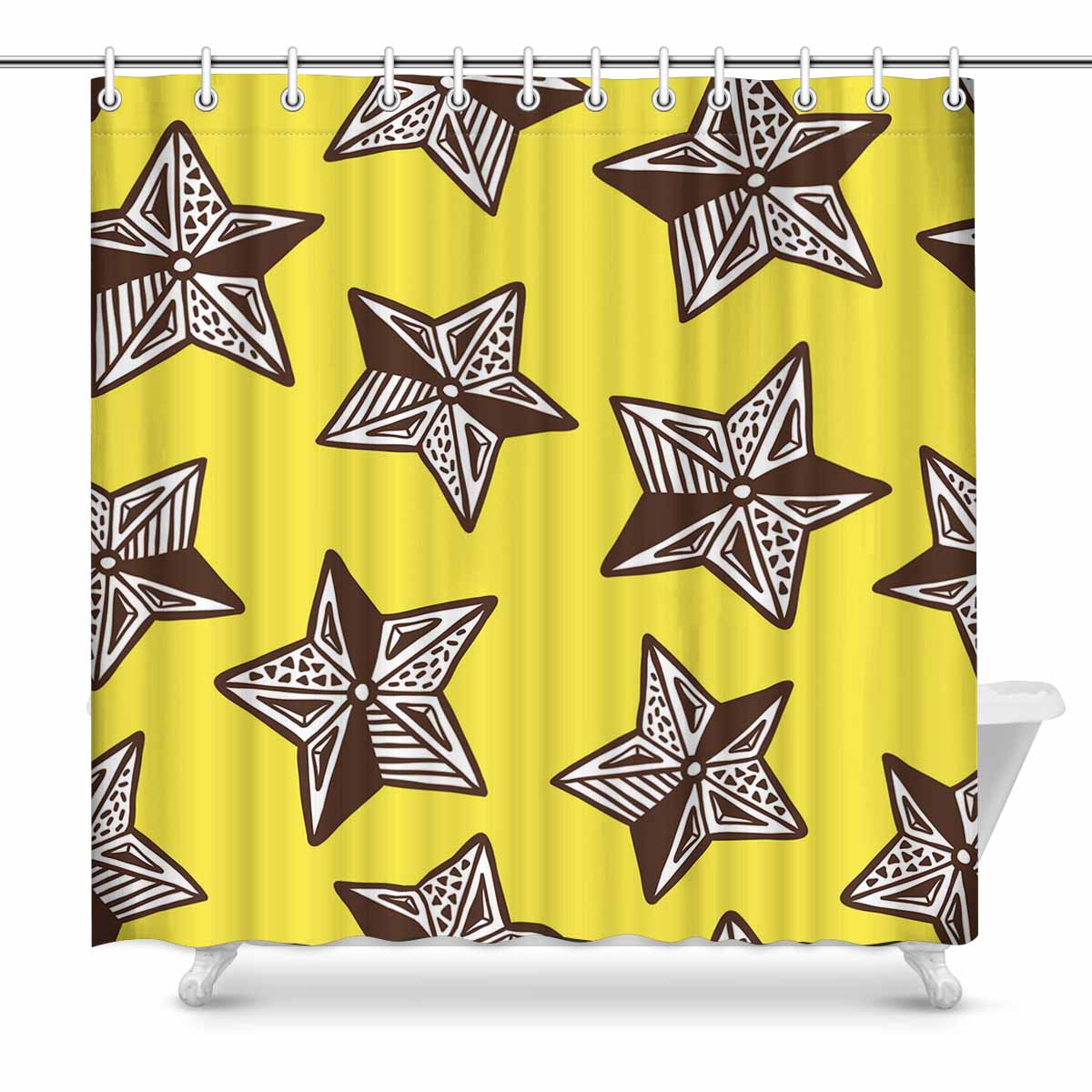 Designed for standardized bath tubs, fitted with C-shaped curtain hooks. Tough durable waterproof polyester fabric, preventing water from splashing out of the shower stall. One-side printing, using heat dye sublimation technique, long-lasting effects.