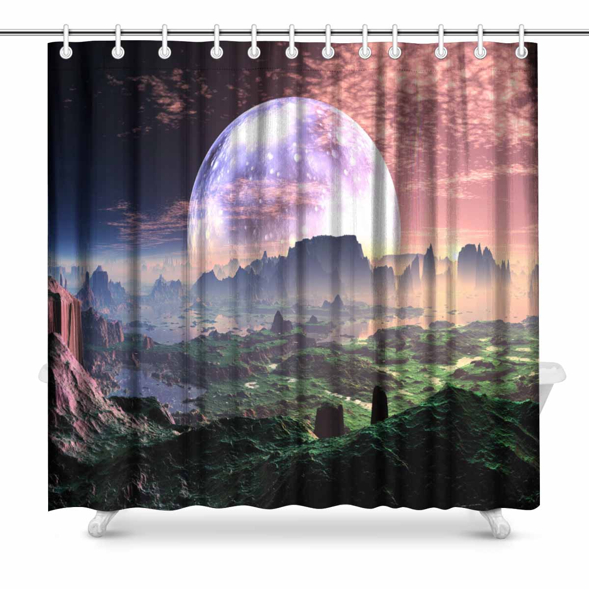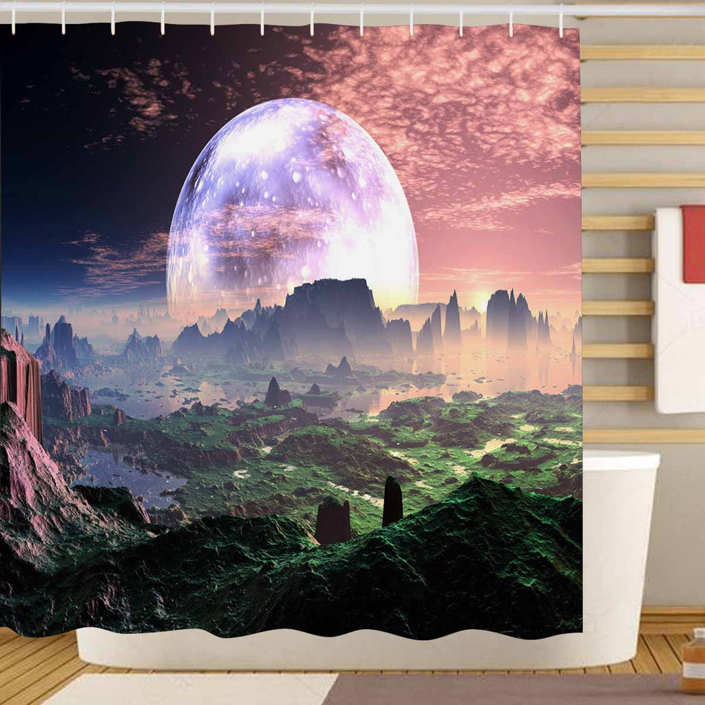 Galaxy themed Shower Curtains print with Dawn on Idyllic Earth-like Planet