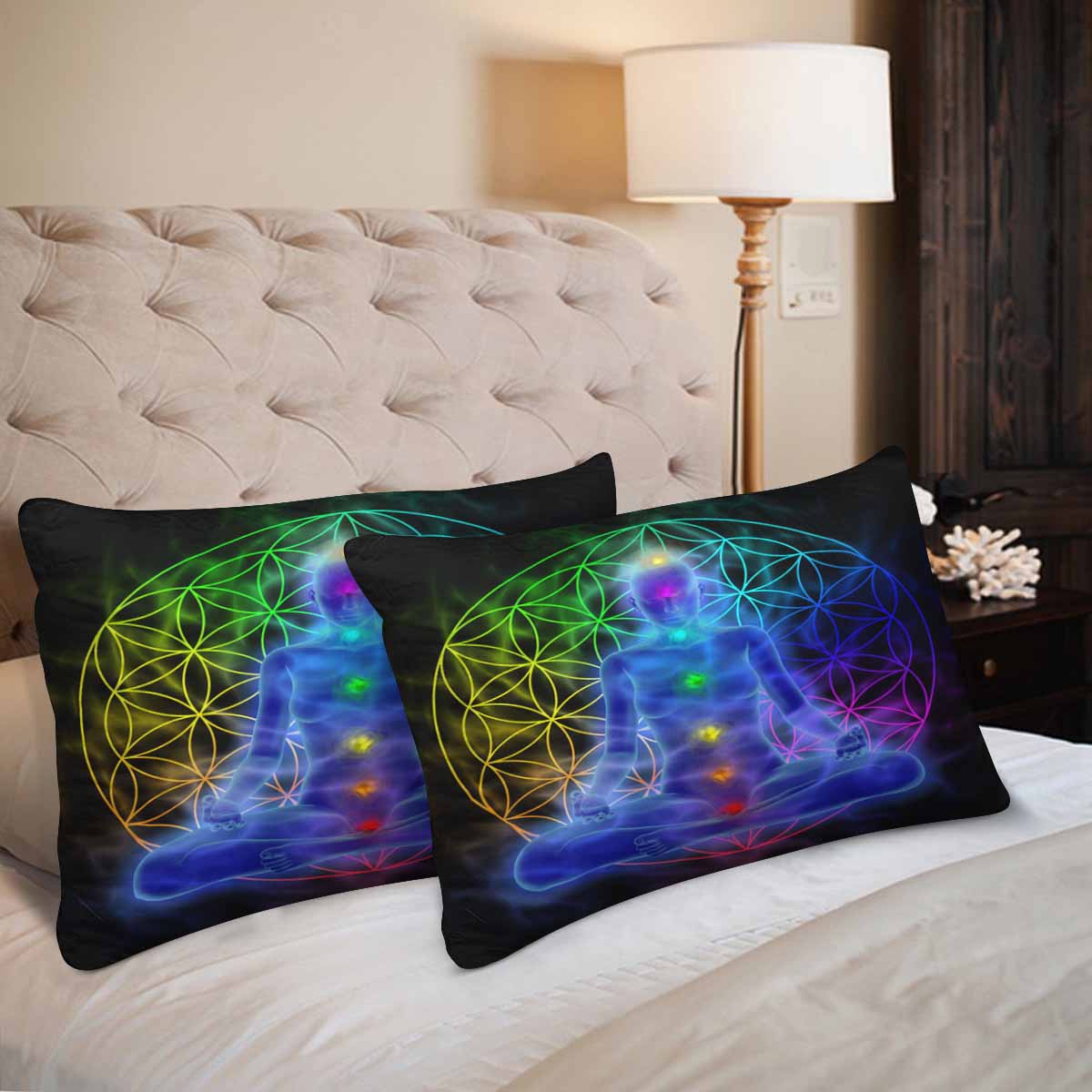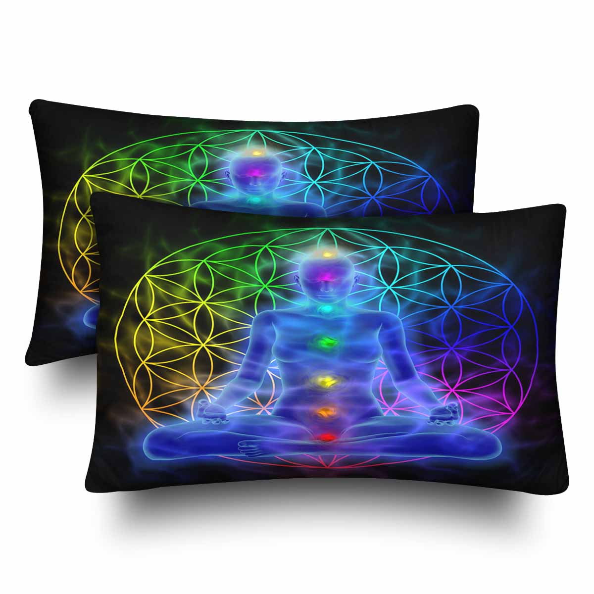 Mandala themed Rectangle Pillow Cases printed Illustration of woman meditating, symbol flower of life