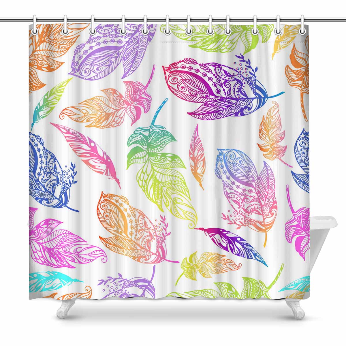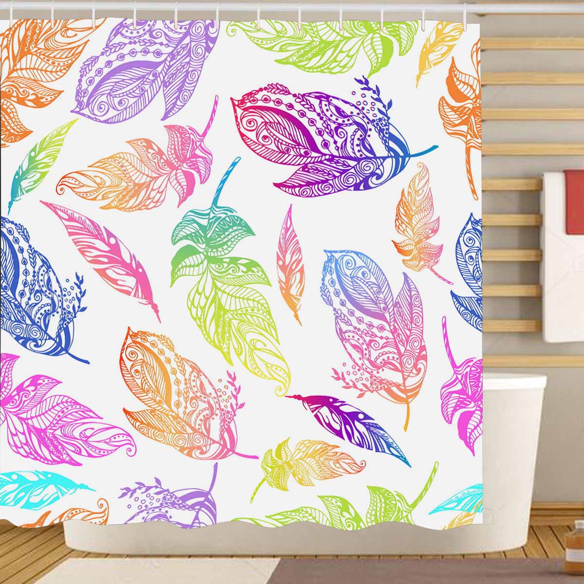 Mandala themed Shower Curtains print with ink bright rainbow gradient colorful feathers on white background