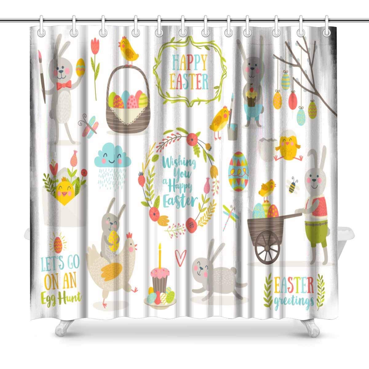 Cute Easter Cartoon Characters Easter Bunny, Chickens, Eggs and Flowers Bathroom Accessories, Shower Curtain with Hooks