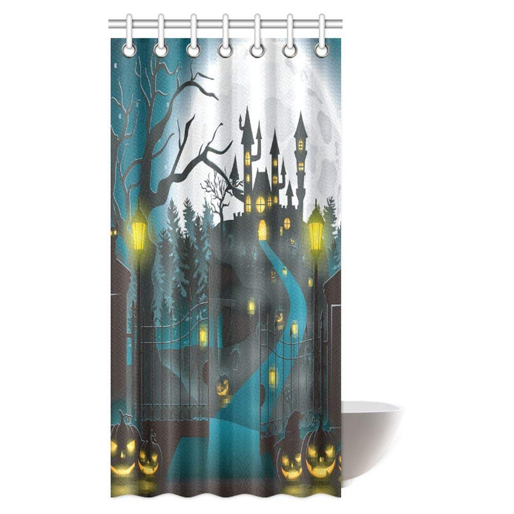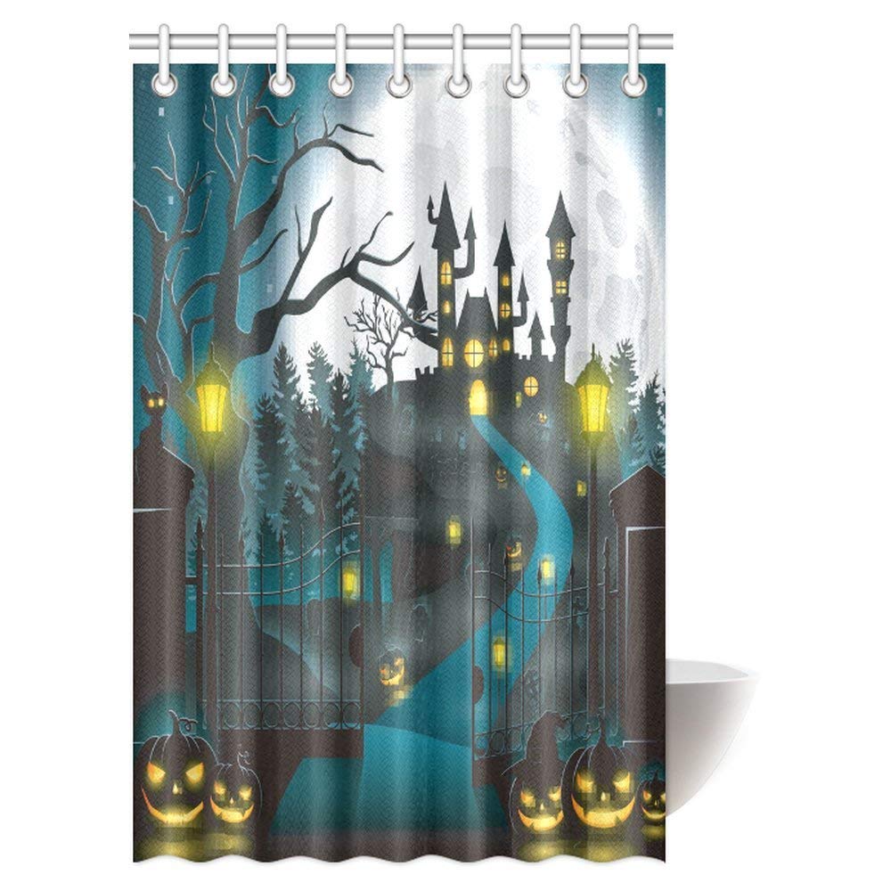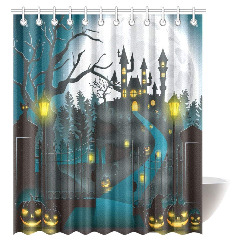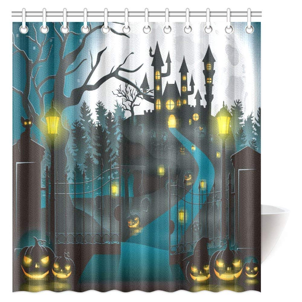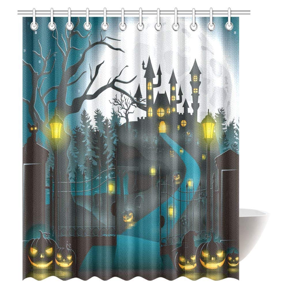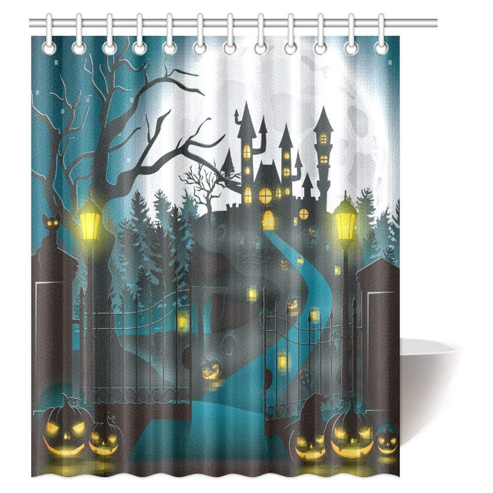 Halloween Decor Shower Curtain, Cartoon Halloween With Castle And Pumpkin Fabric Bathroom Shower Curtain With Hooks