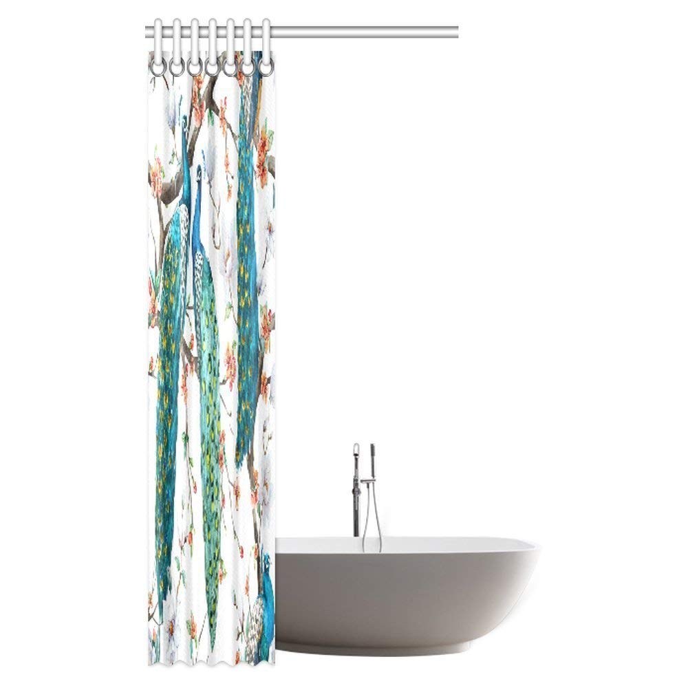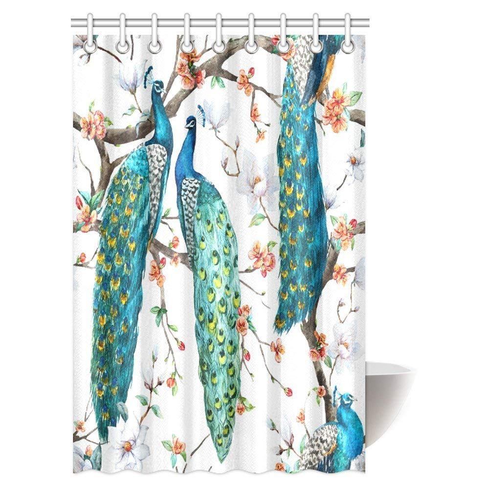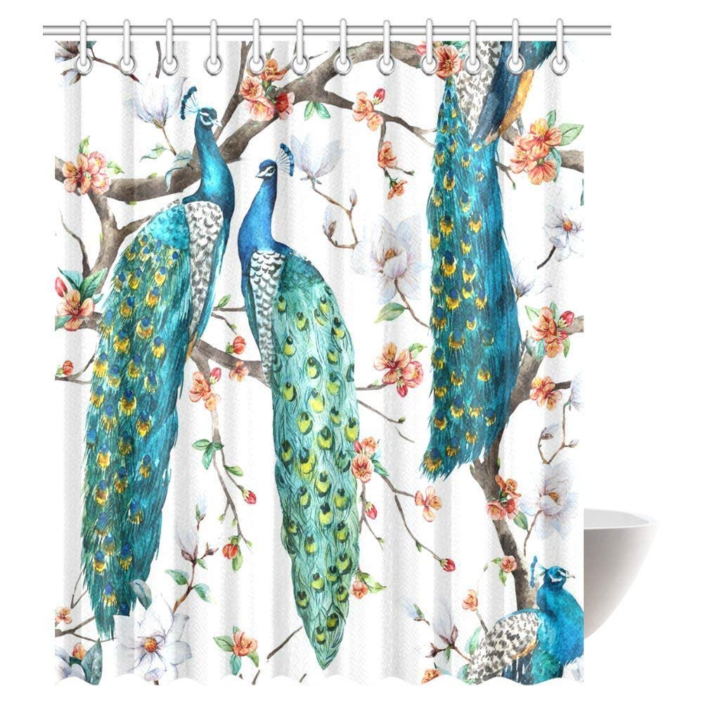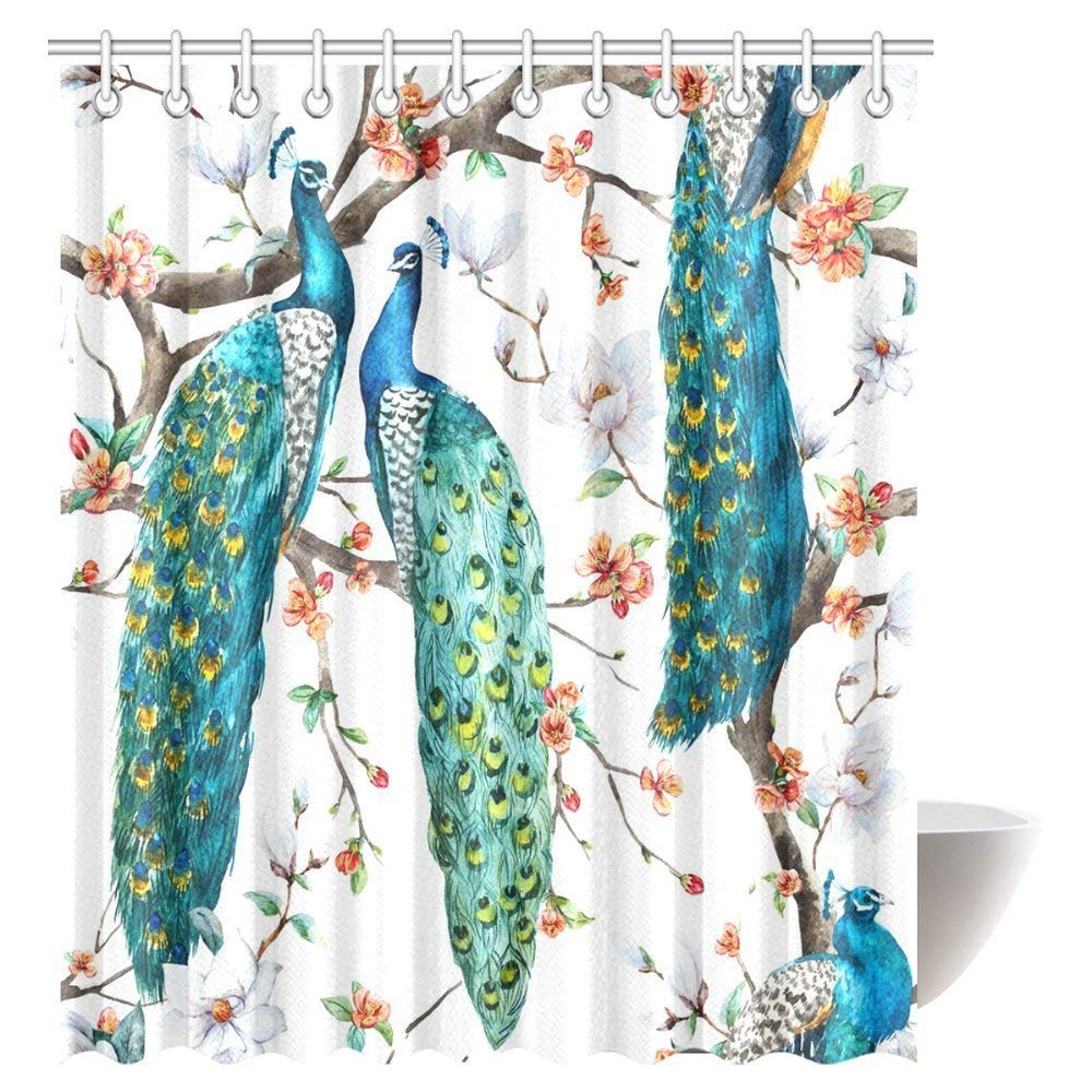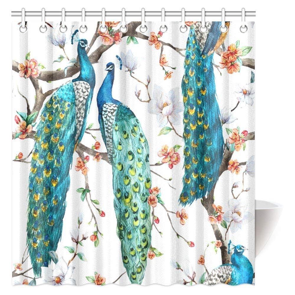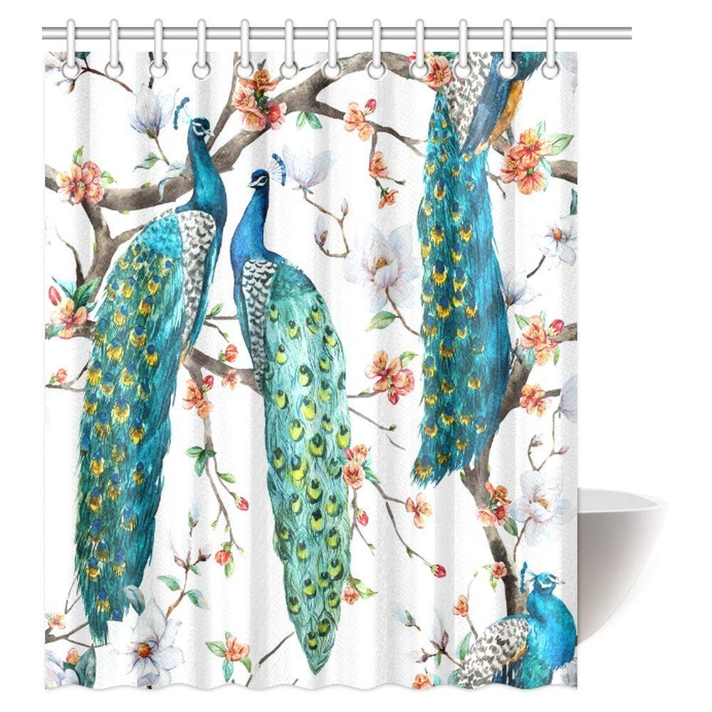 Peacock Lover Shower Curtain, Peacock on Blooming Cherry Trees, White Magnolia Flowers and Sakura Bathroom Shower Curtain