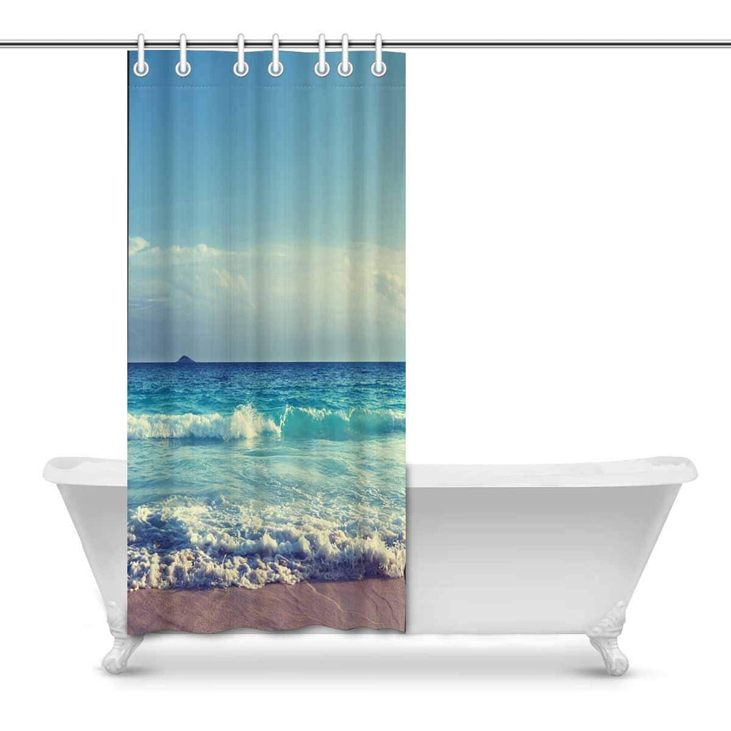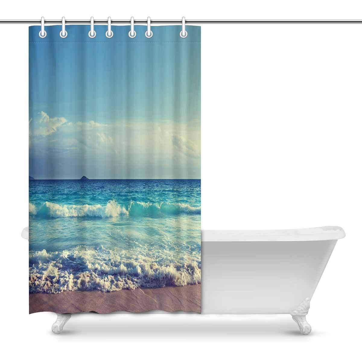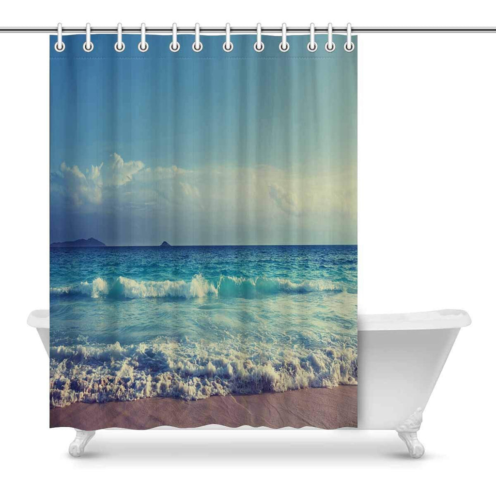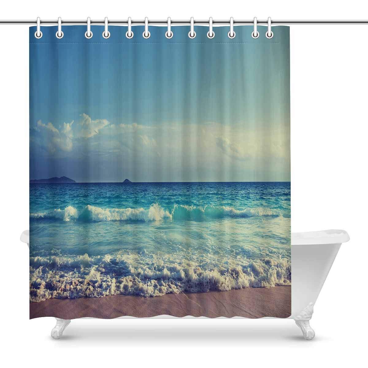 Seychelles Beach with Ocean Wave Fabric Bathroom Shower Curtain Decor Set with Hooks