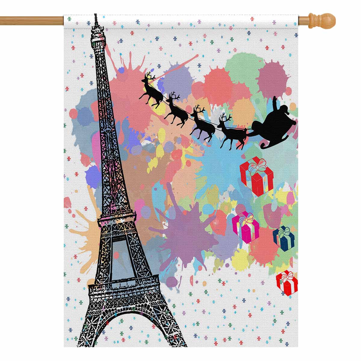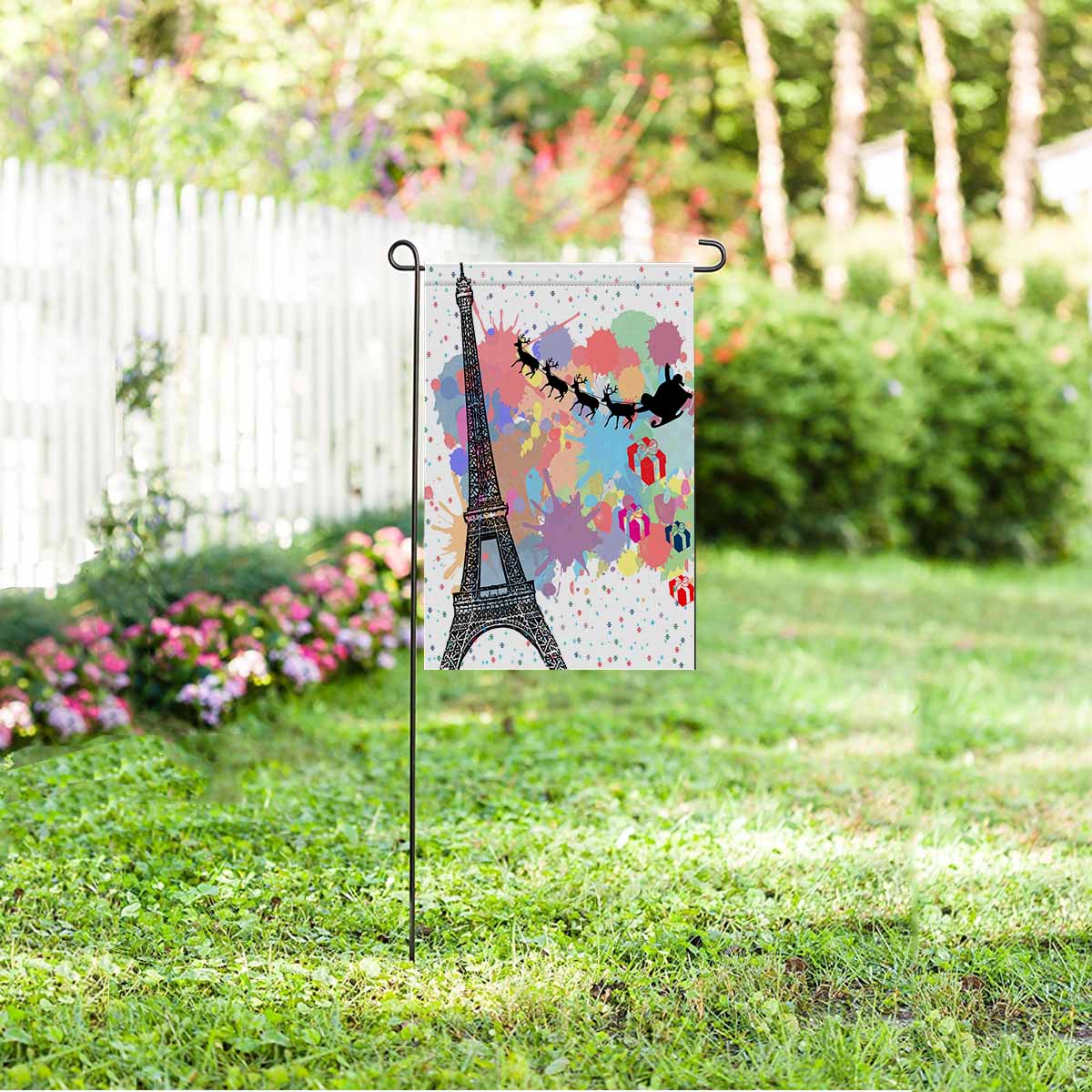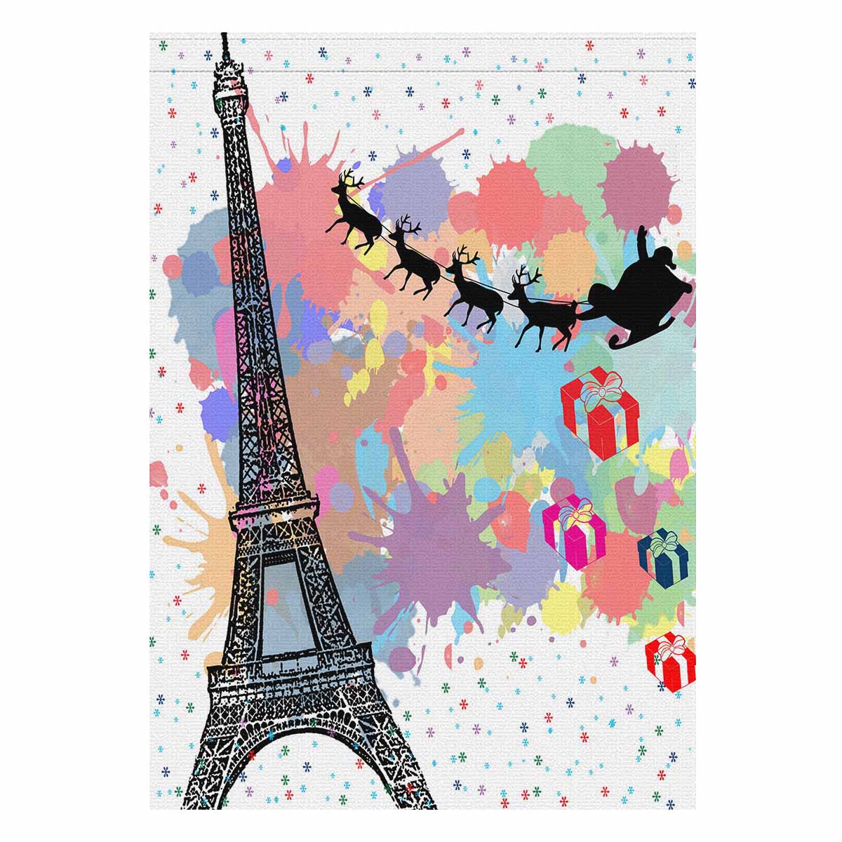 Garden Flags printed Nature Landscape themed with Santa's sleigh flying over Paris with clolored splash background