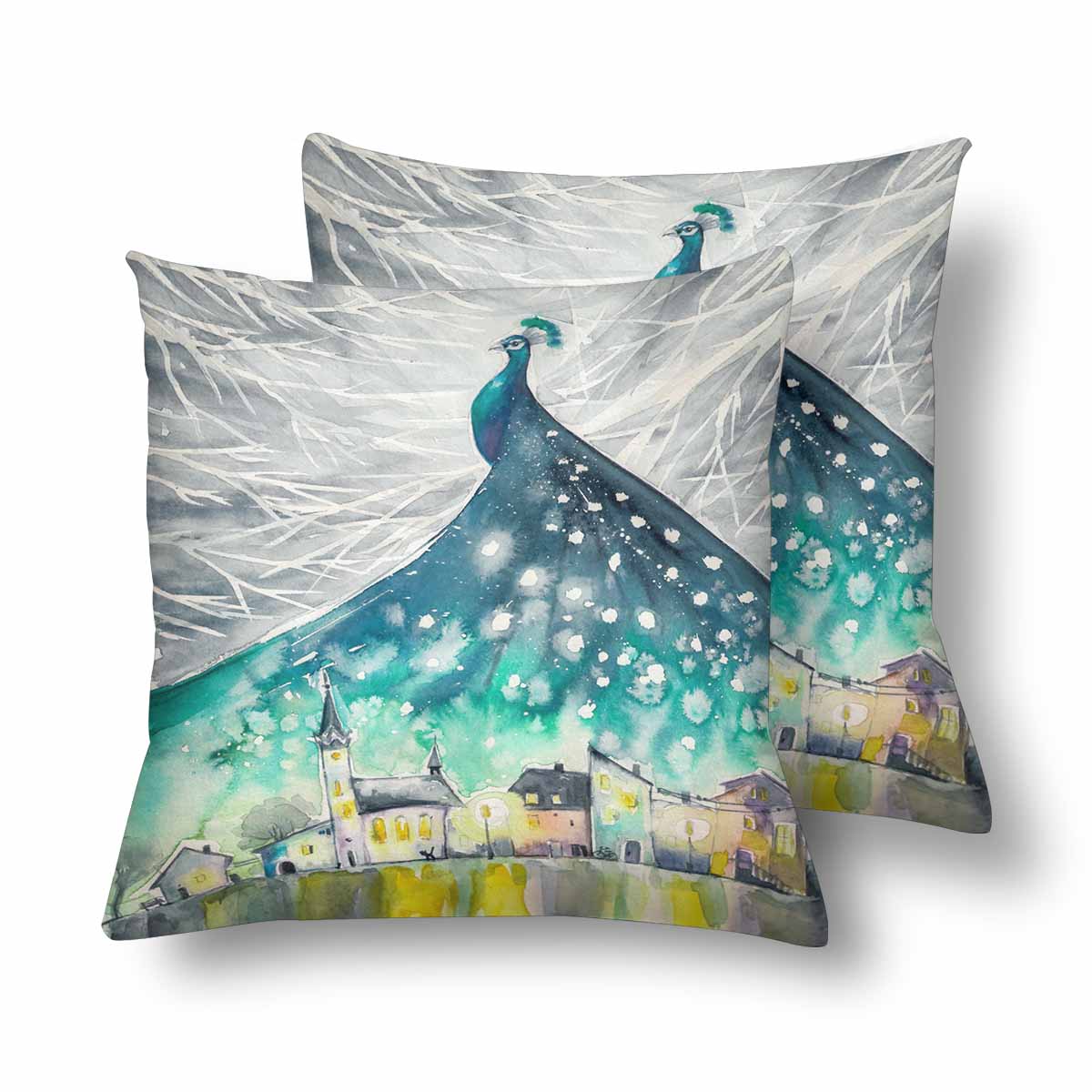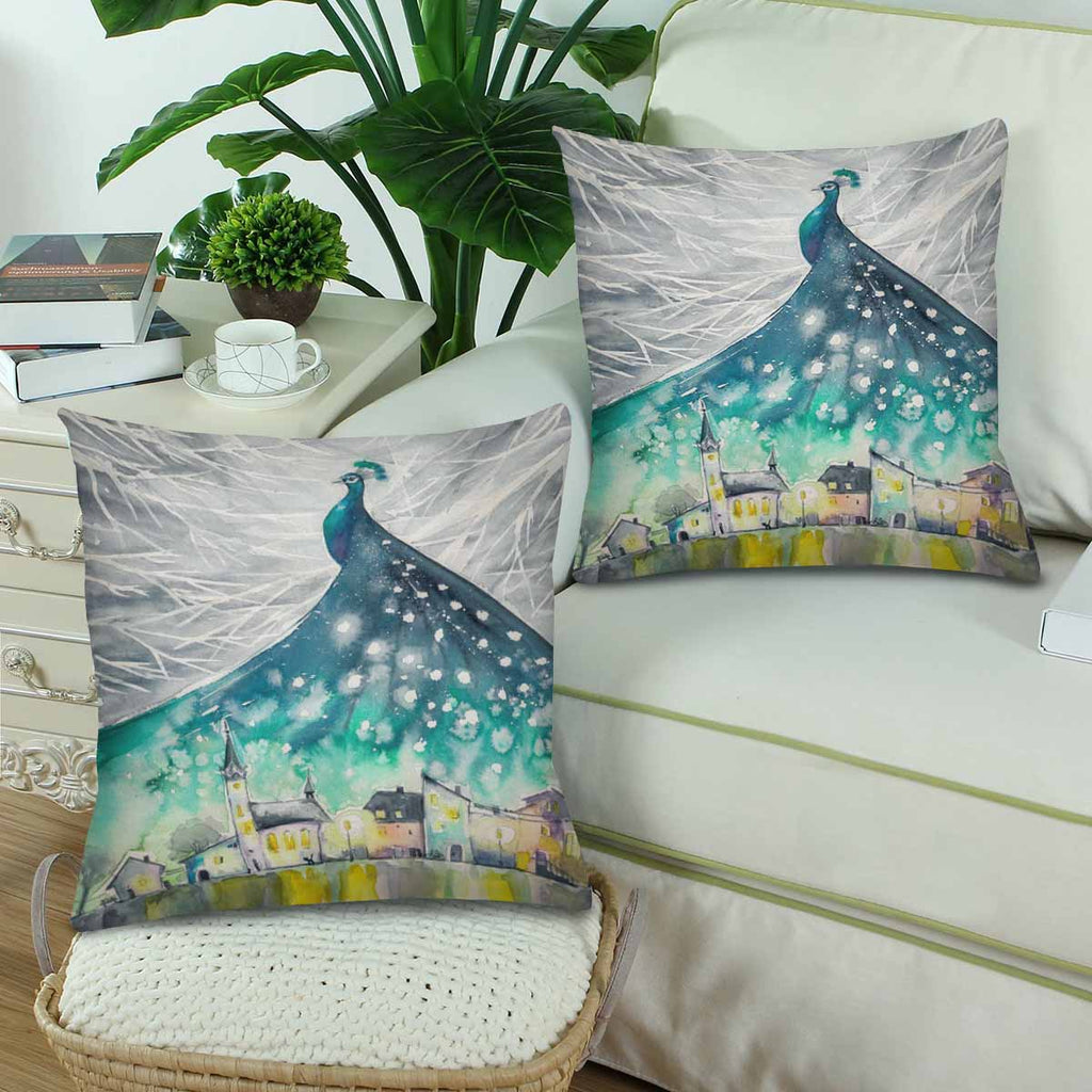 Animals themed Pillow Cases printed with watercolors abstract illustratcion of peacock as night sky over city