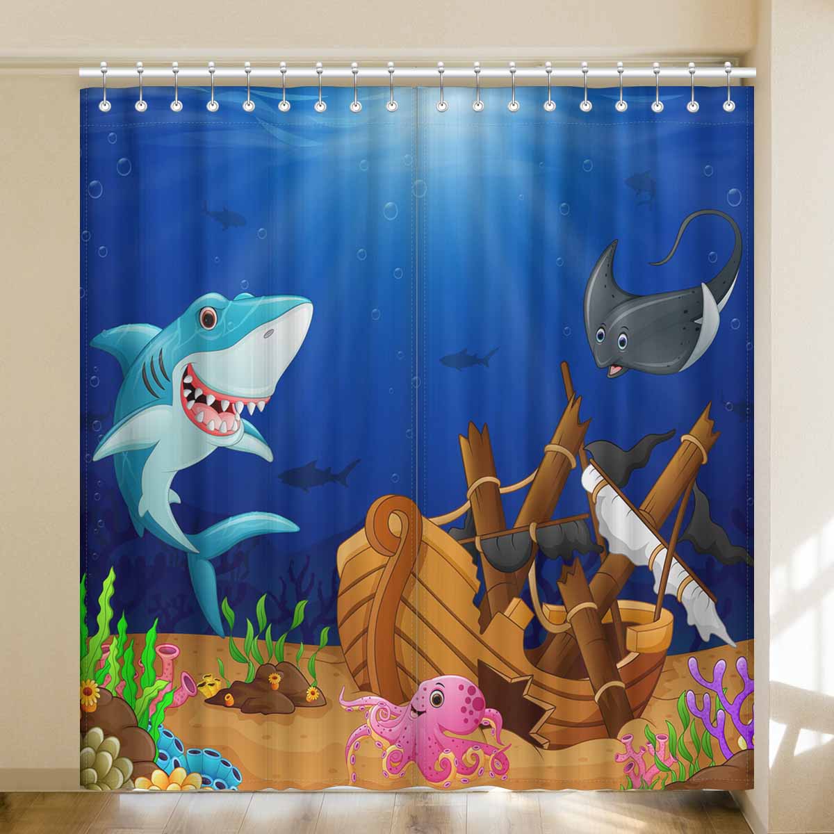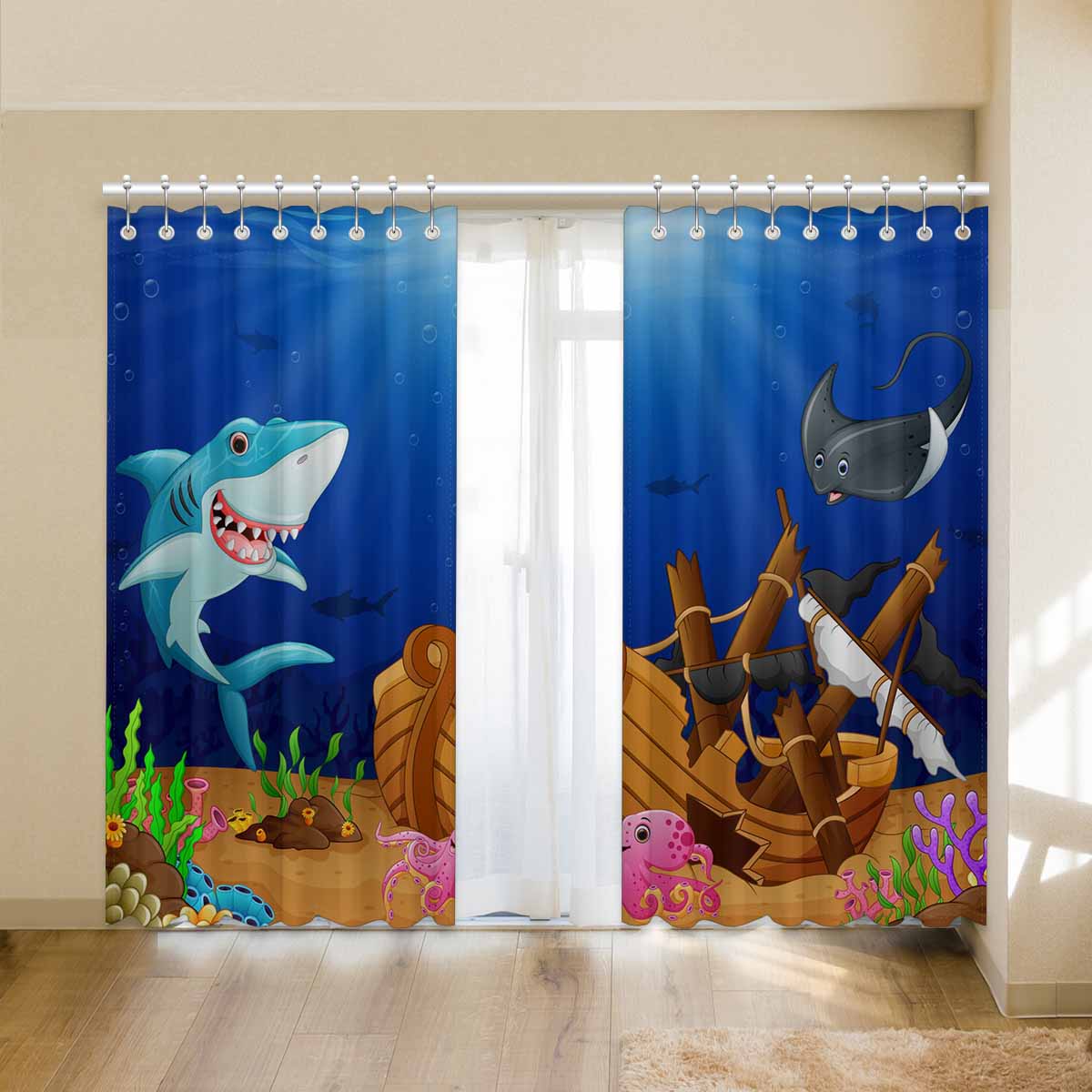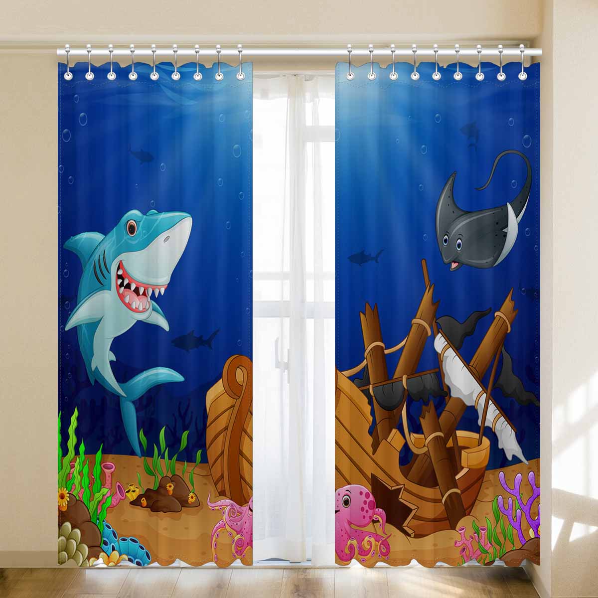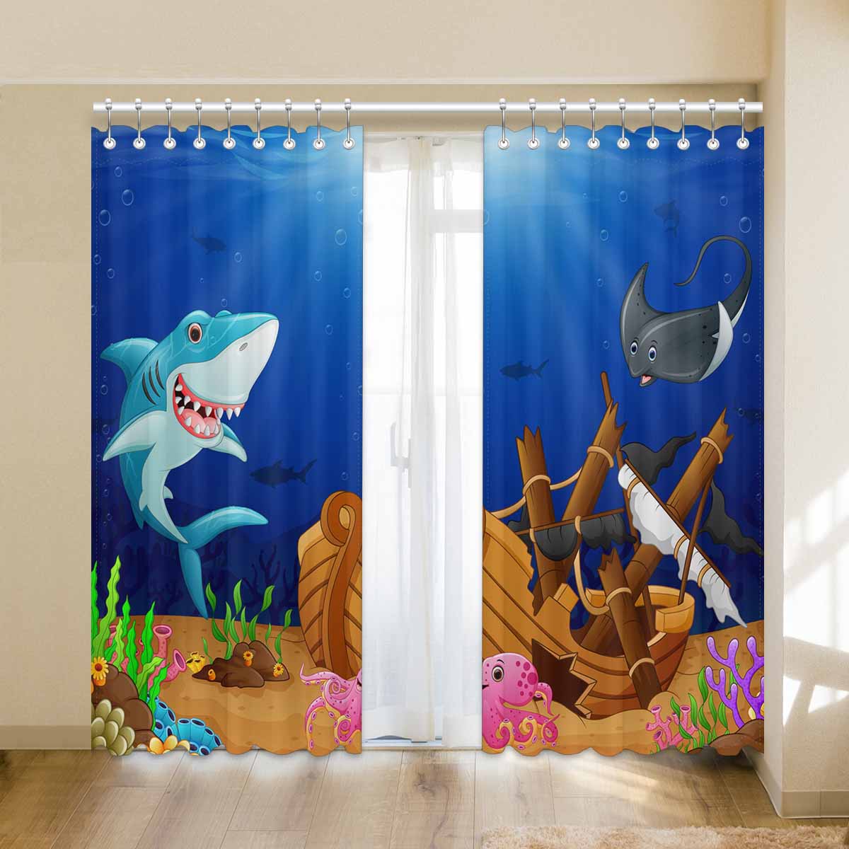 Seaworld Window Curtains print Cartoon shark with swordfish under the sea