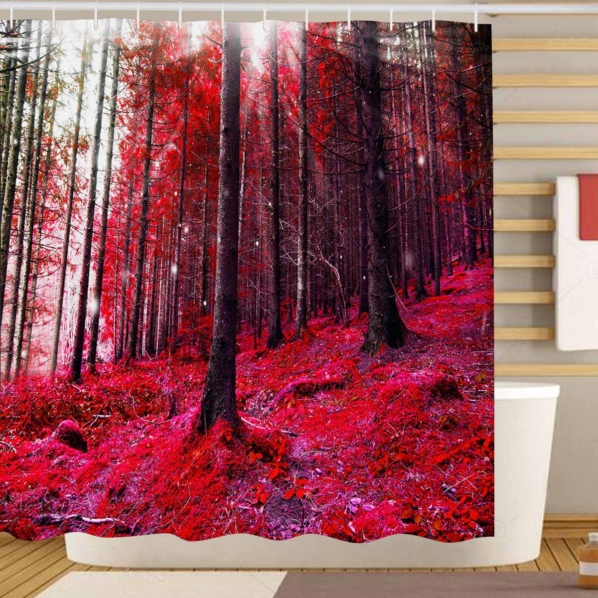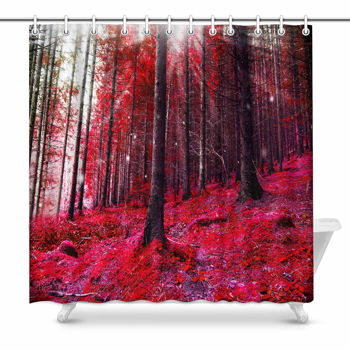 Three and Mouttain themed Shower Curtains Red fantasy forest with magic lights and sunbeams
