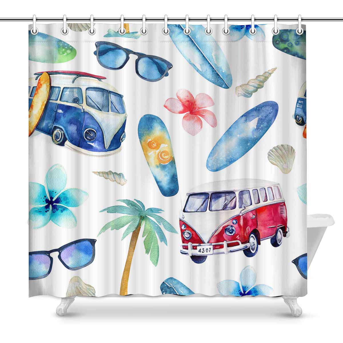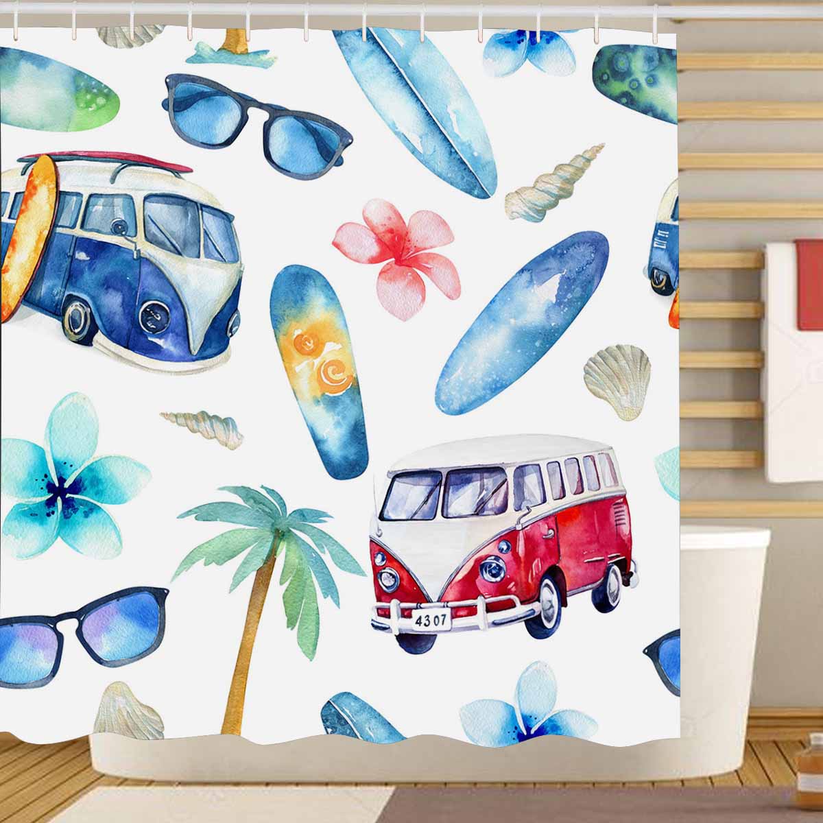 Tropical themed Shower Curtains watercolor ocean surfing set beach holiday Tropicall travel adventure wagon bus