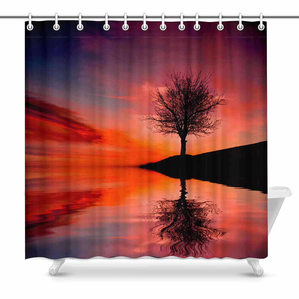 Three and Mouttain themed Shower Curtains Leafless tree near lake on sunset background sky