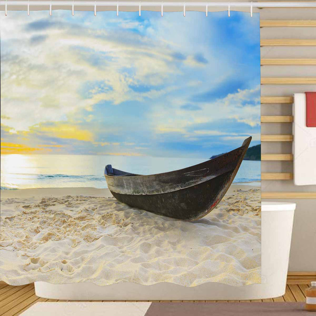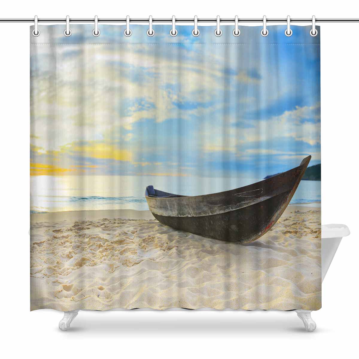 Tropical themed Shower Curtains Old fisherman boat at the beach