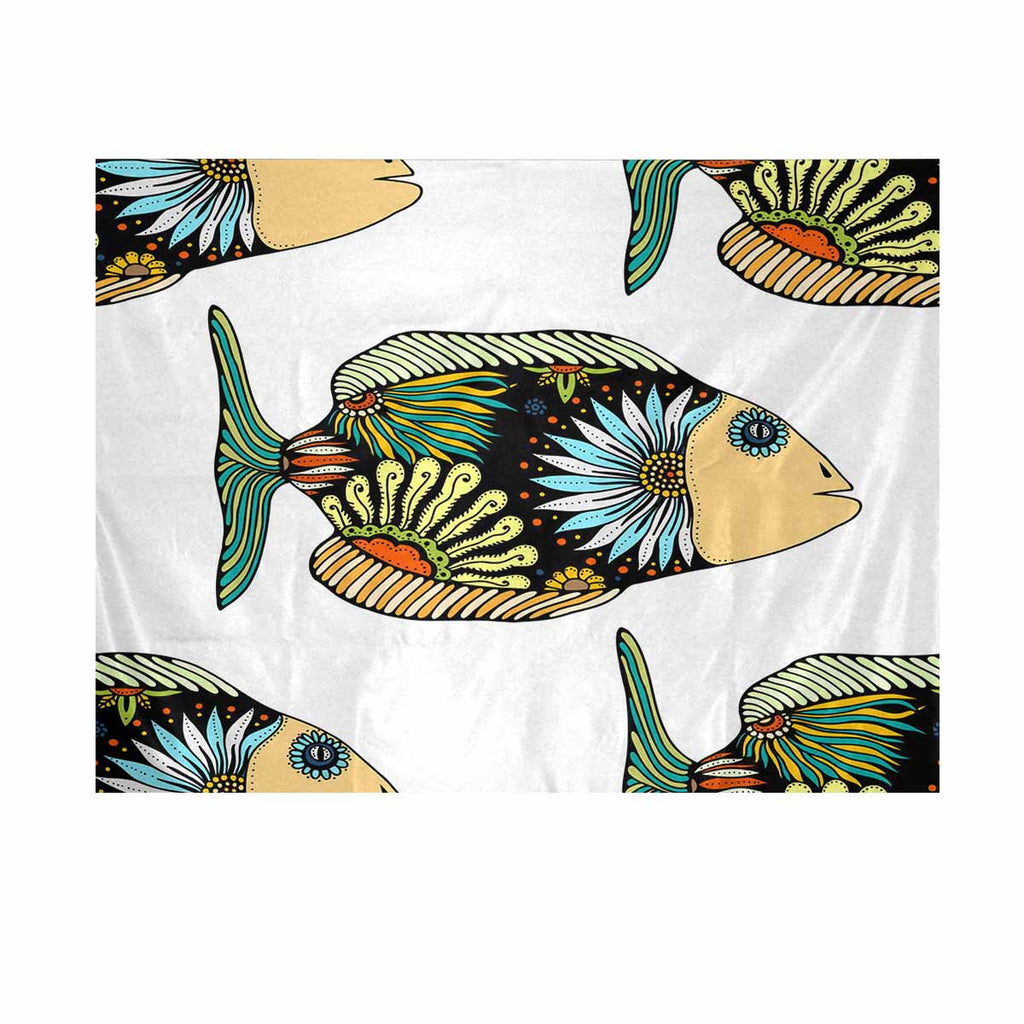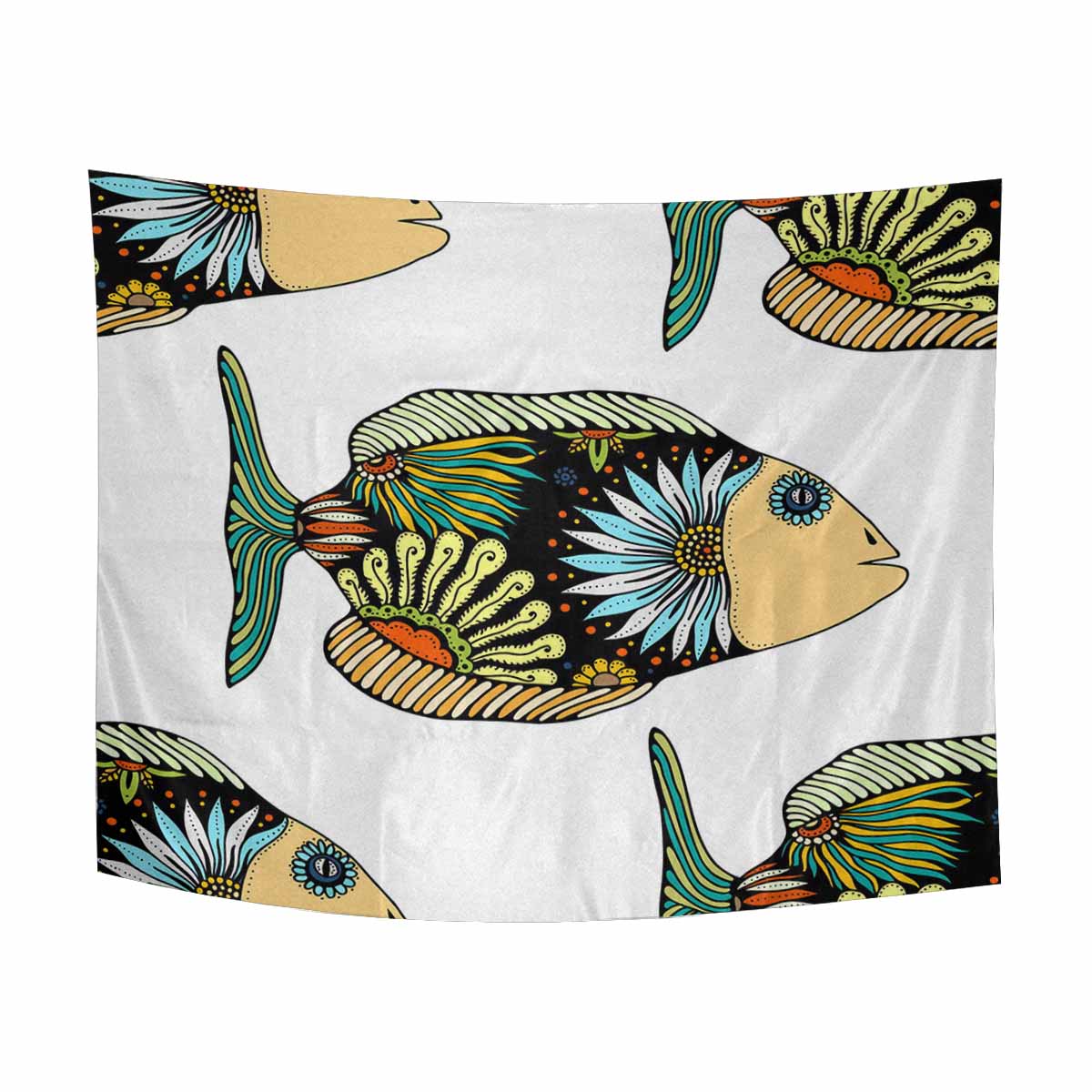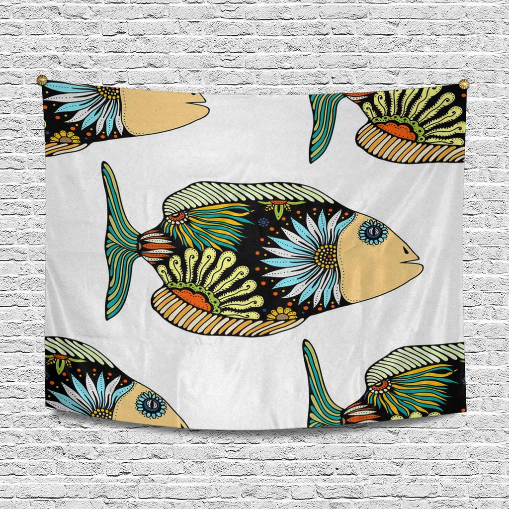 Animals themed Wall Tapestries print with fish with floral elements in doodle style