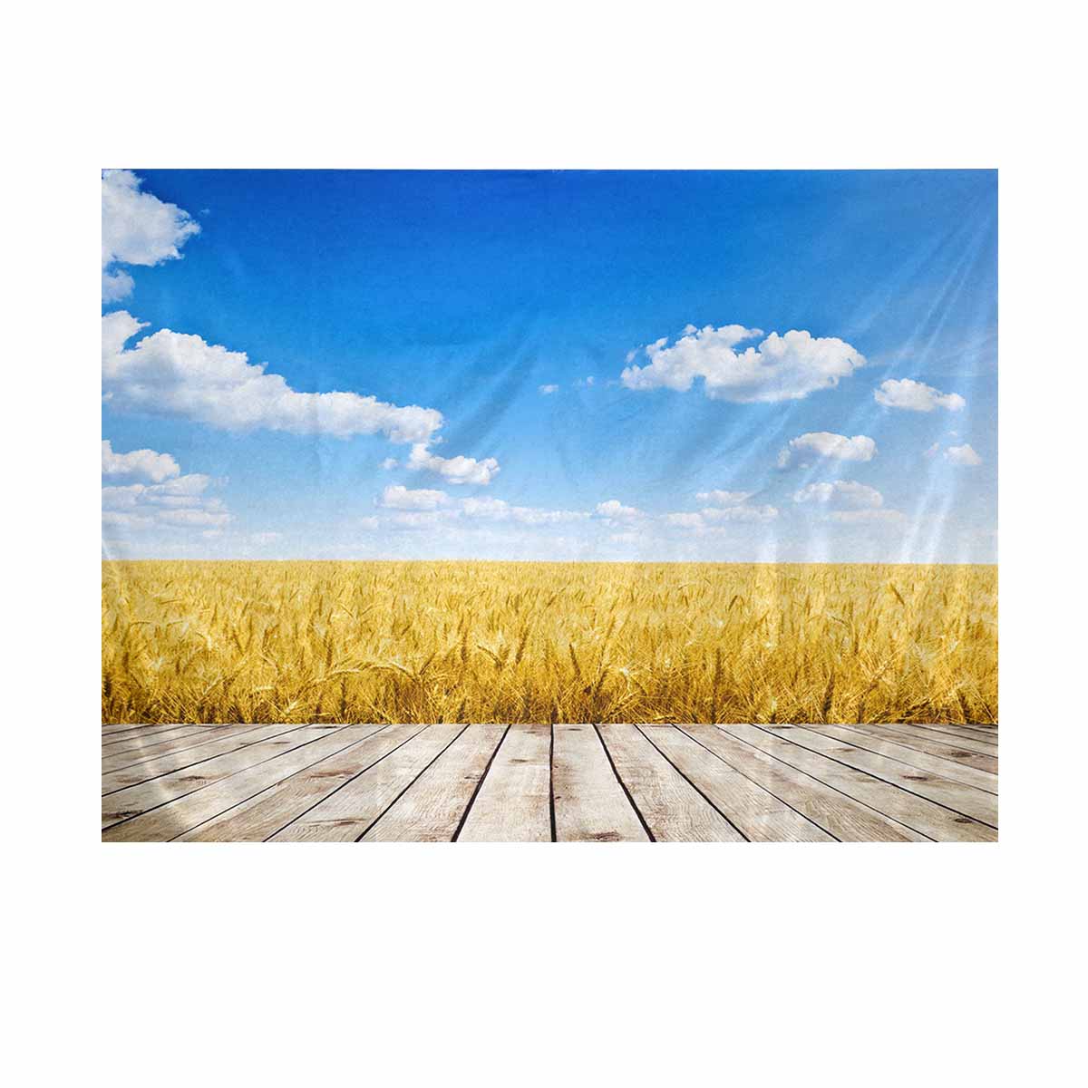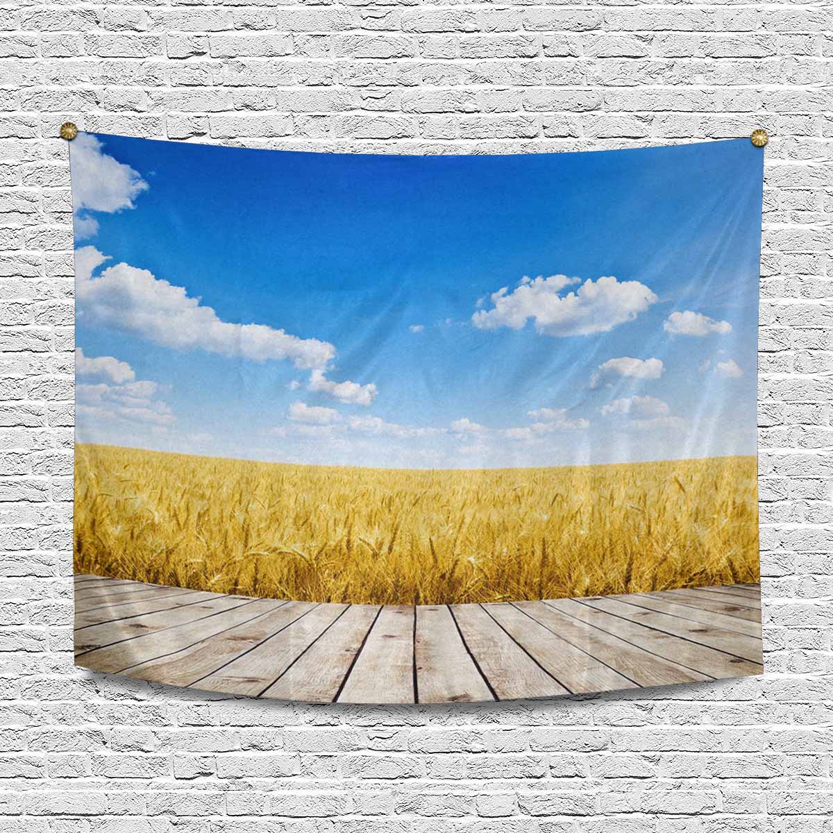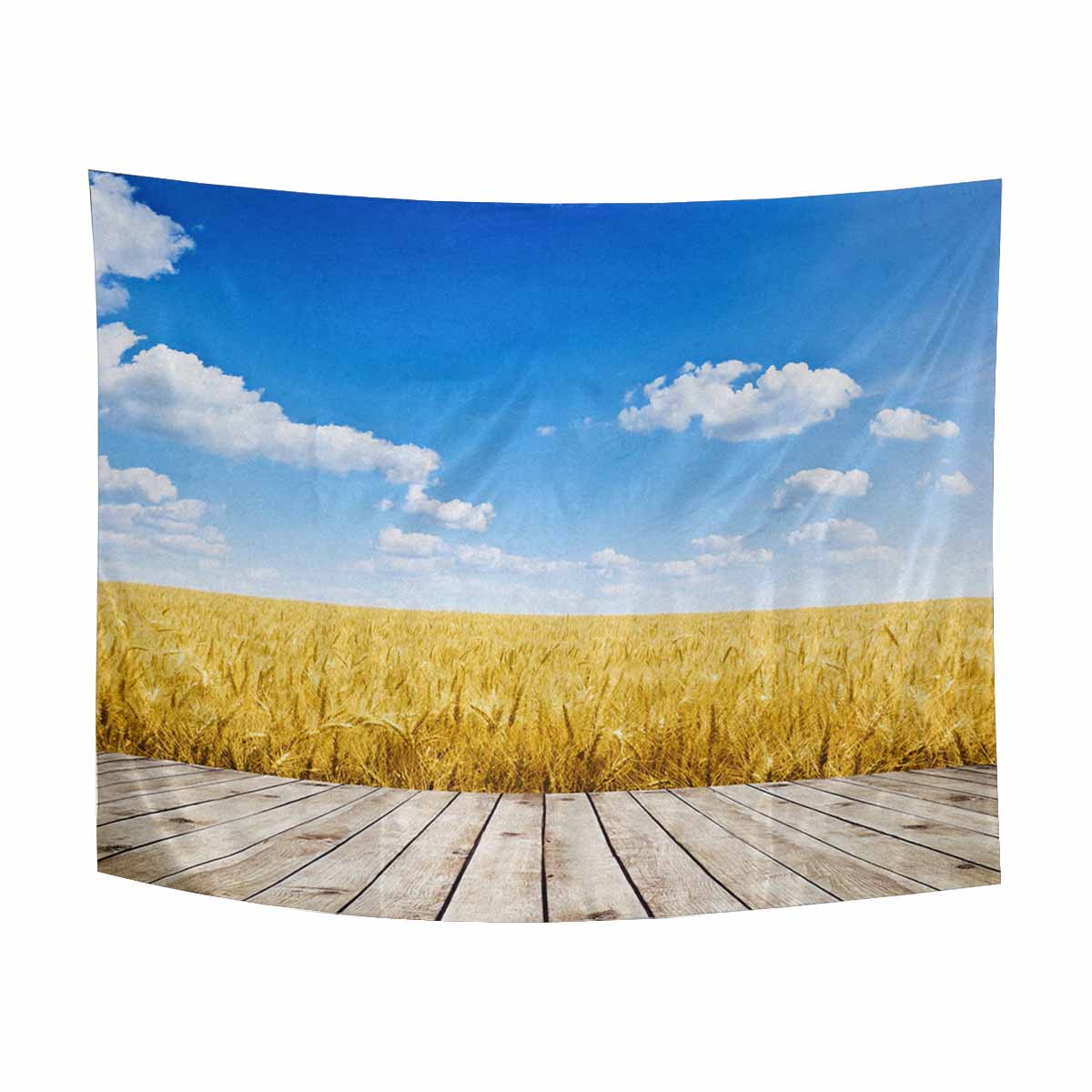 Landscape themed Wall Tapestries printed Wood floor over yellow wheat field under nice sunset cloud sky background