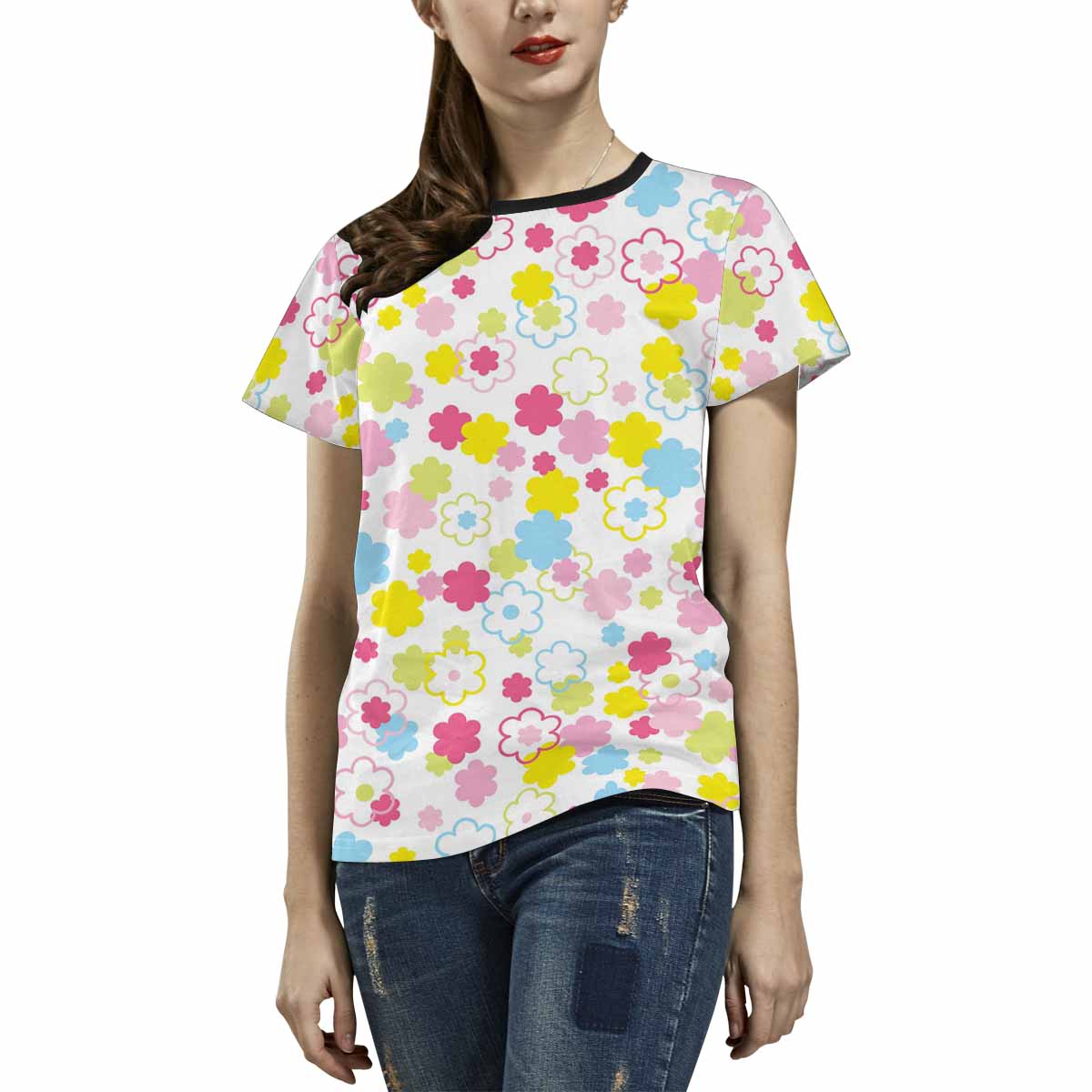 - 10.23 Oz. Polyester fabric. Dye-sublimation printing, Personalized all-over print T-shirt for women.