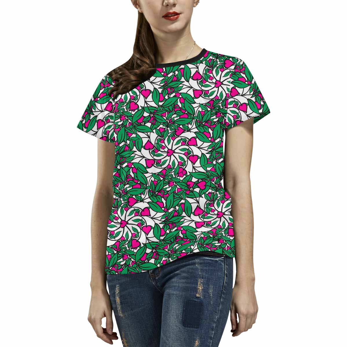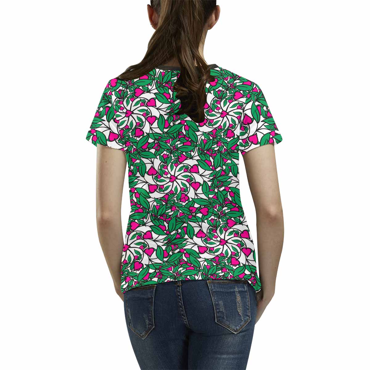 - 10.23 Oz. Polyester fabric. Dye-sublimation printing, Personalized all-over print T-shirt for women.