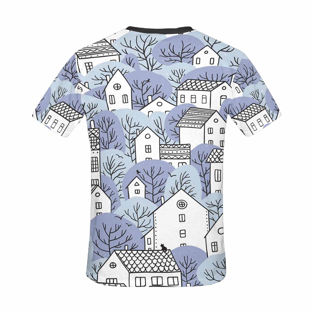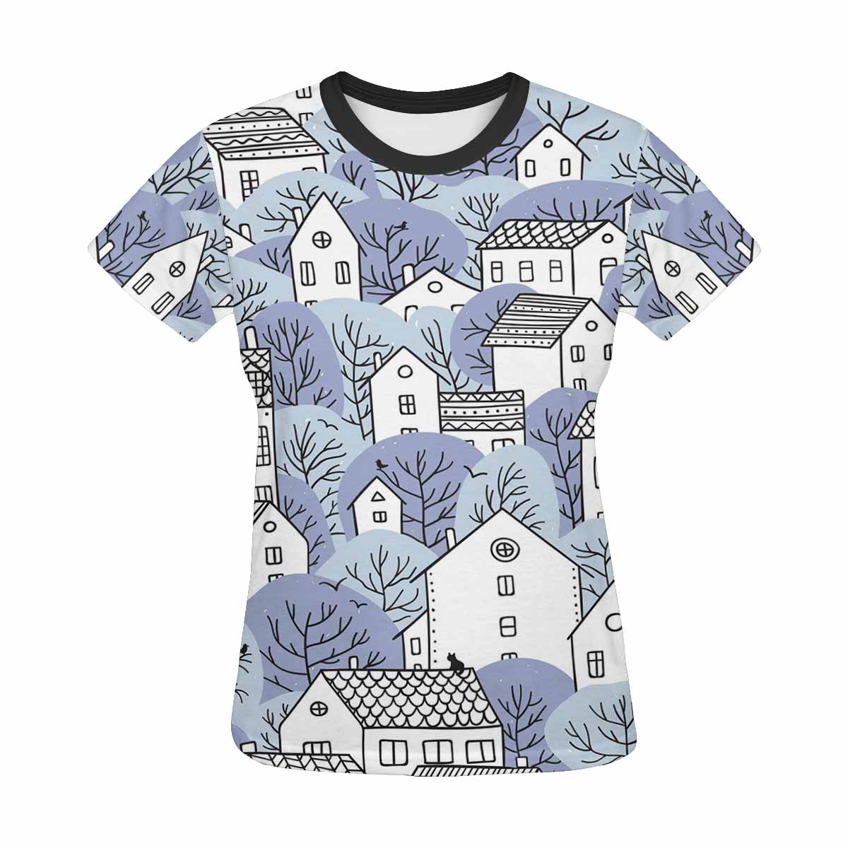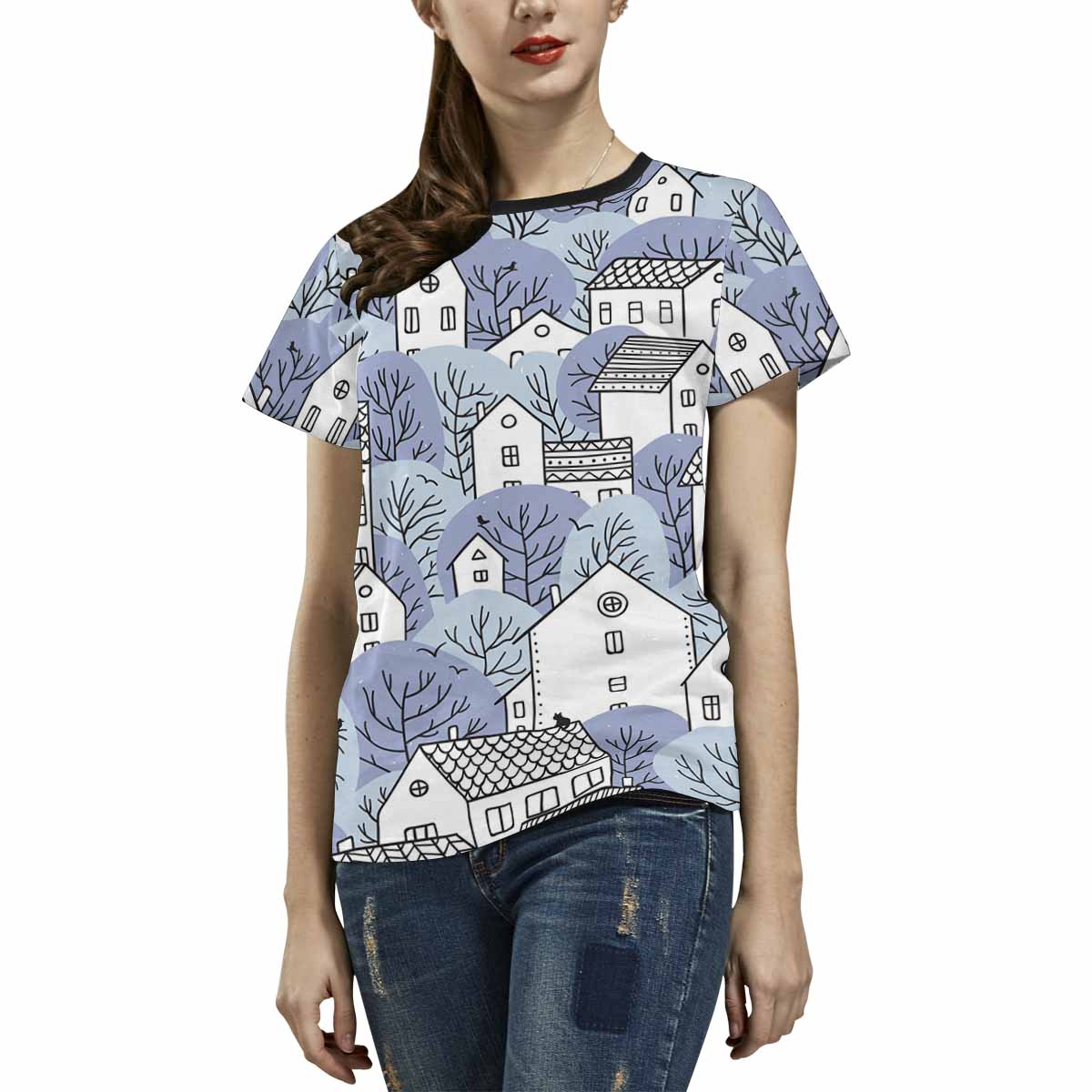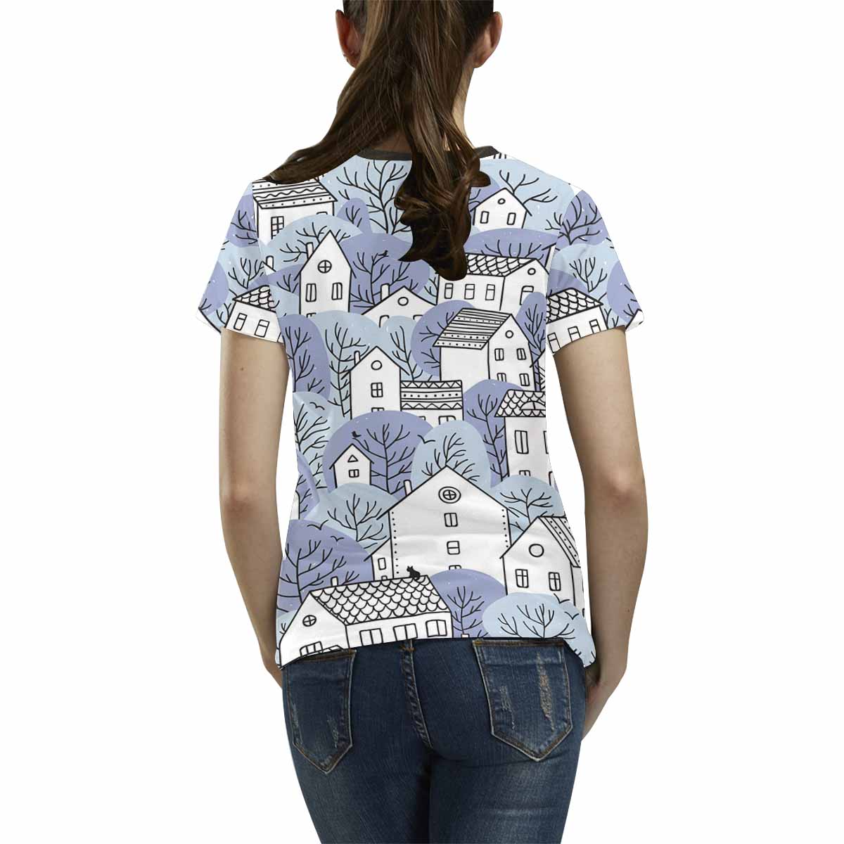 Womens graphic T-Shirts print with winter Trees and houses pattern