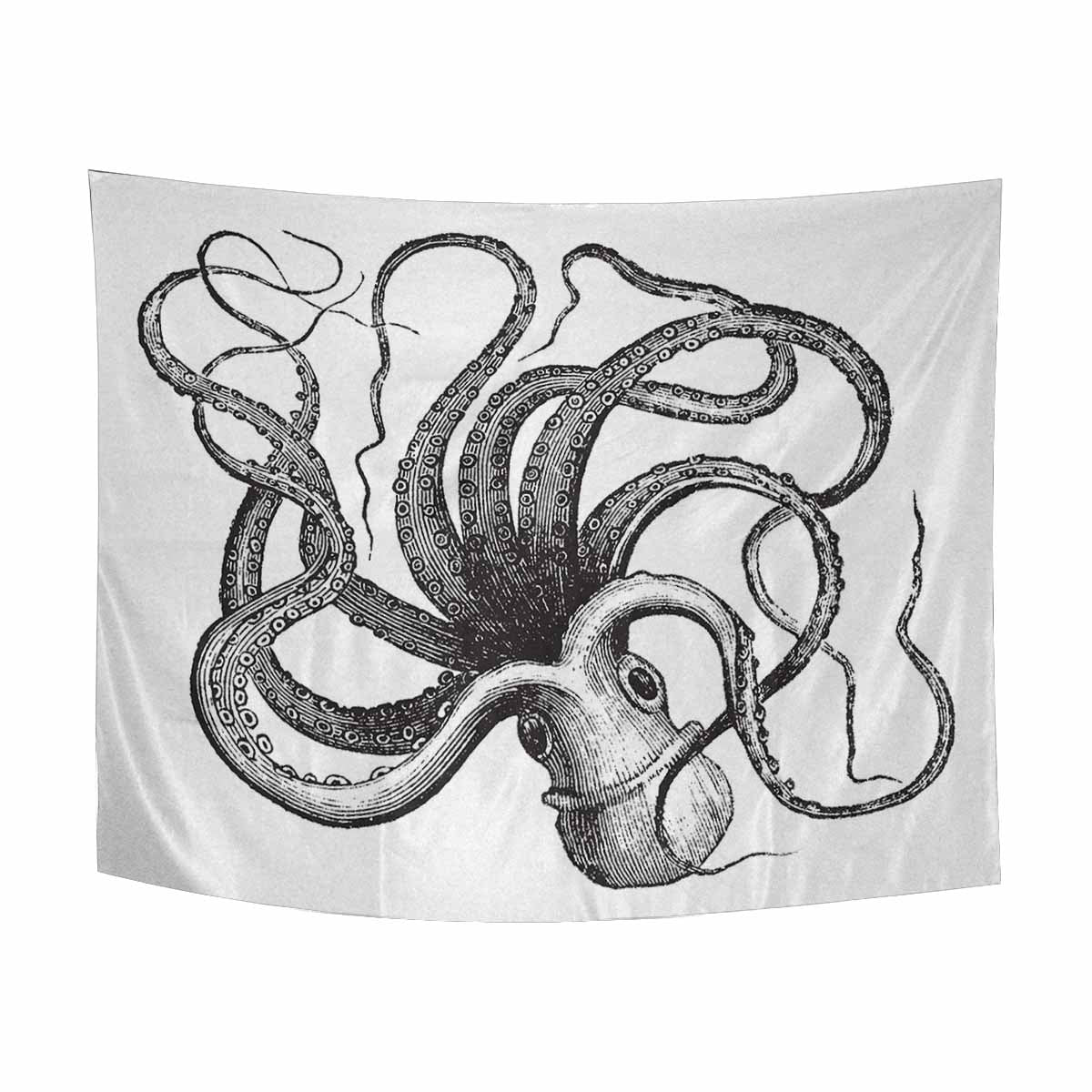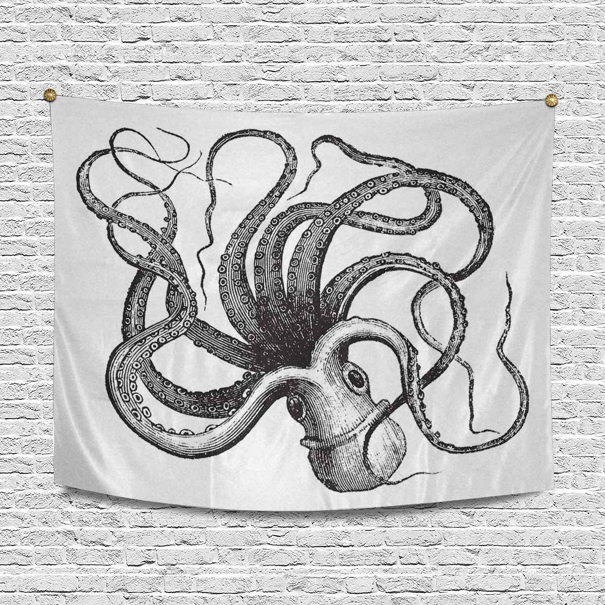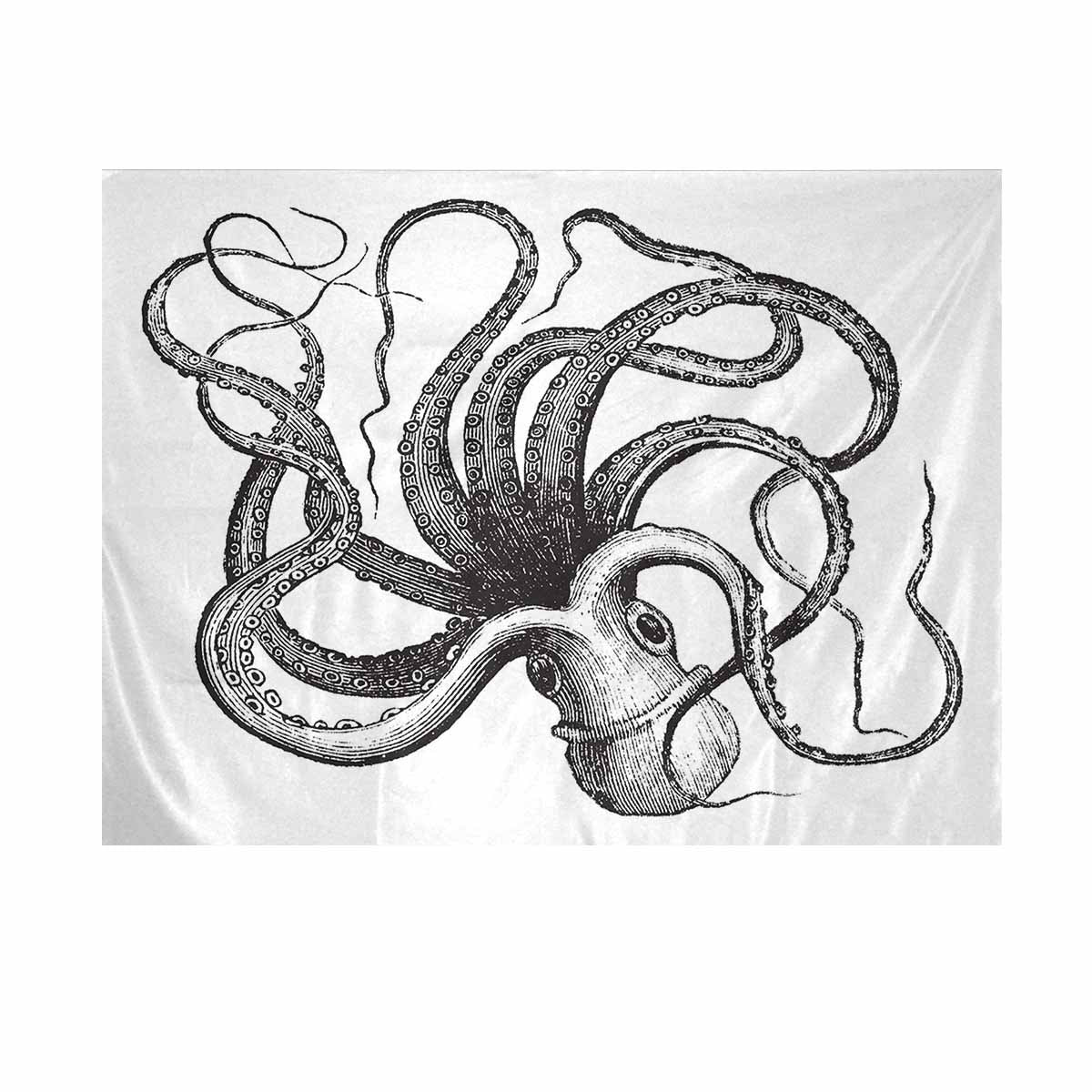 Animals themed Wall Tapestries print with octopus isolated on white, vintage engraved illustration
