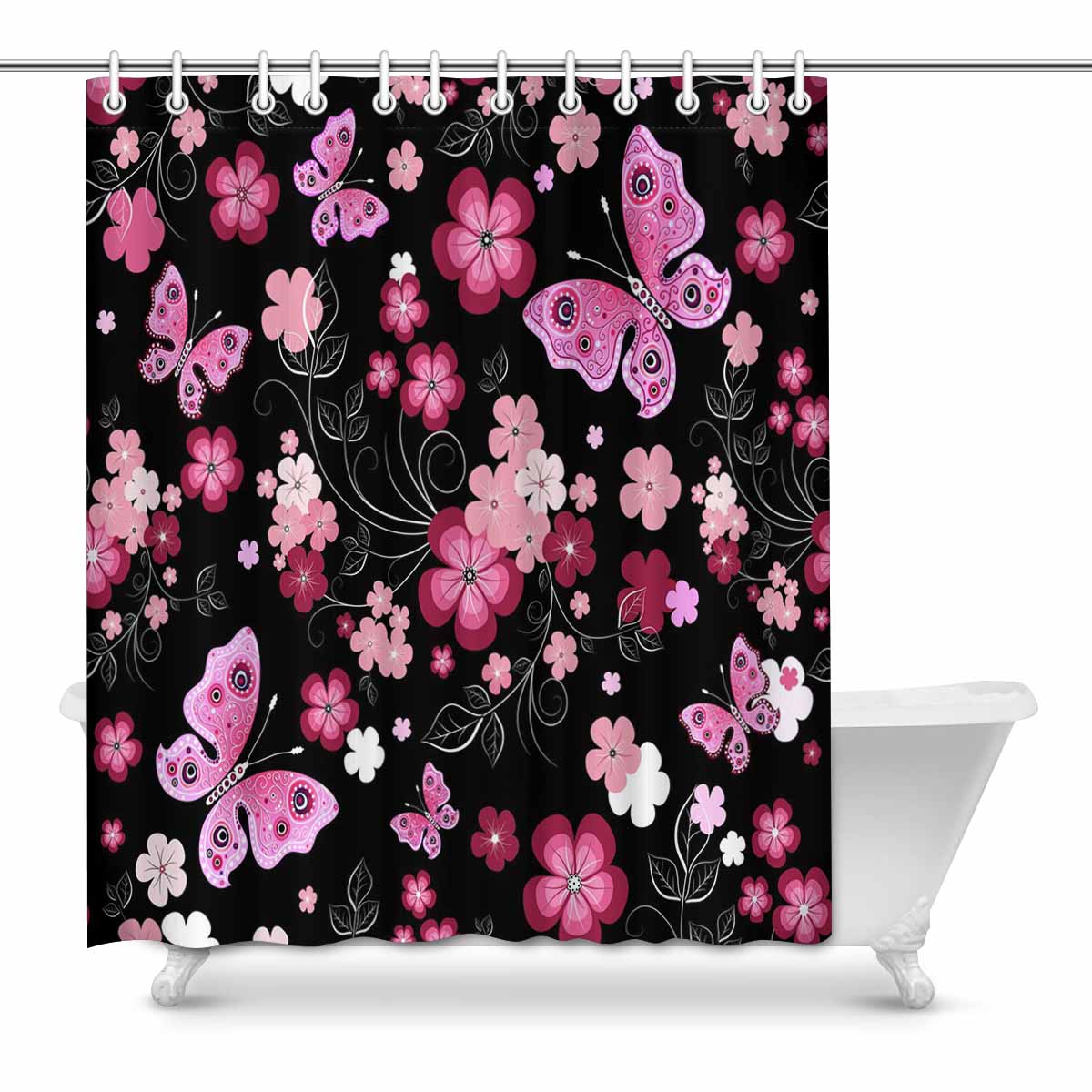Bathroom Shower Curtain 60in x 72in with dark pink Butterfly flowers pattern