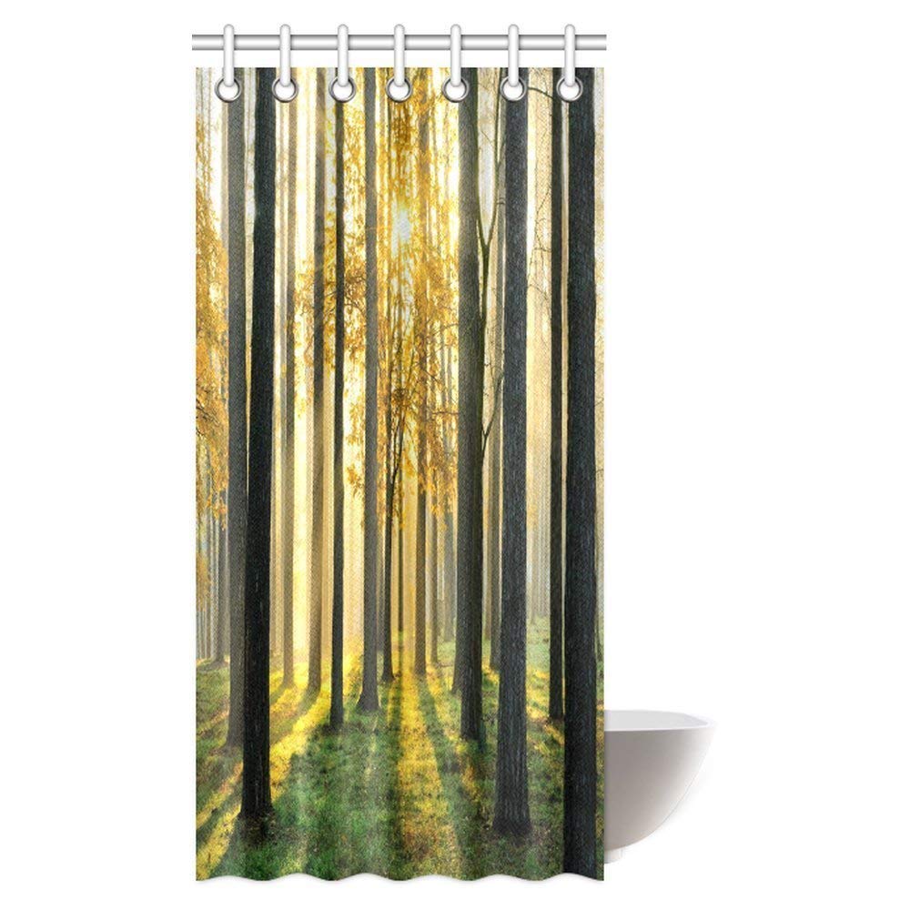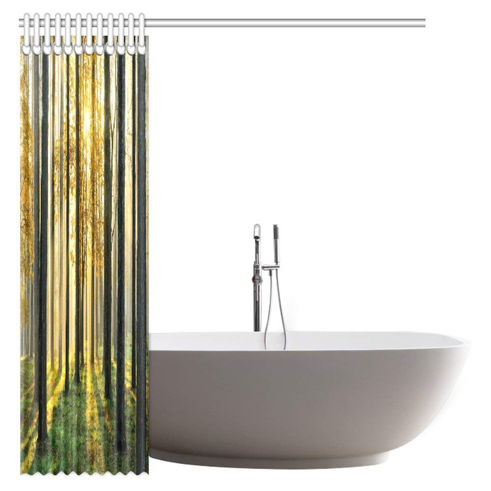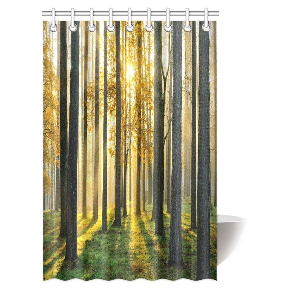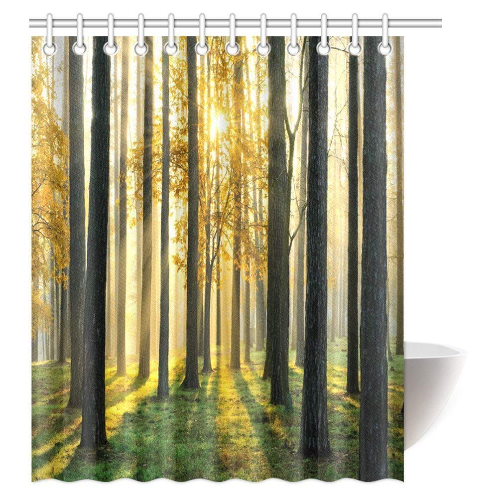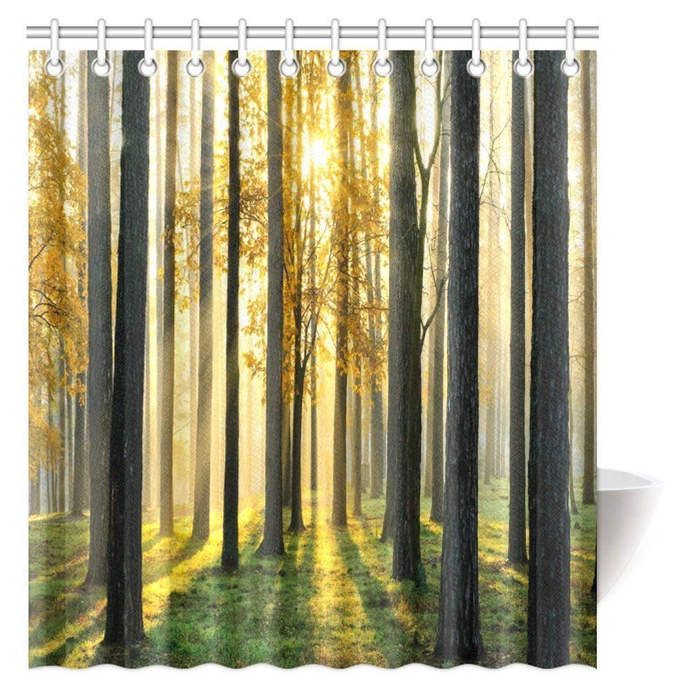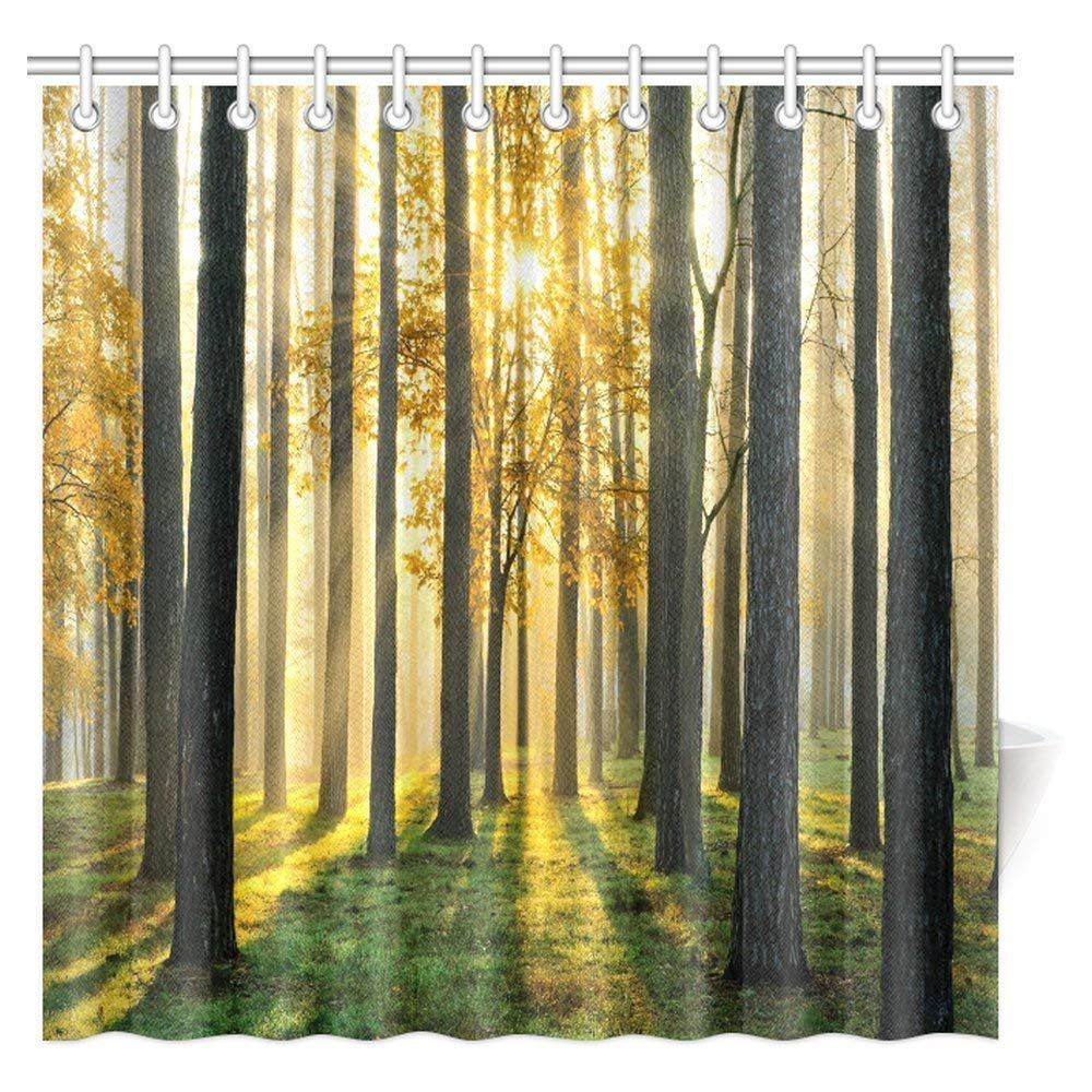 Nature Scene Decor Shower Curtain, Beautiful Morning Scene in the Forest with Sun Rays and Long Shadows Fabric Bathroom Set with Hooks