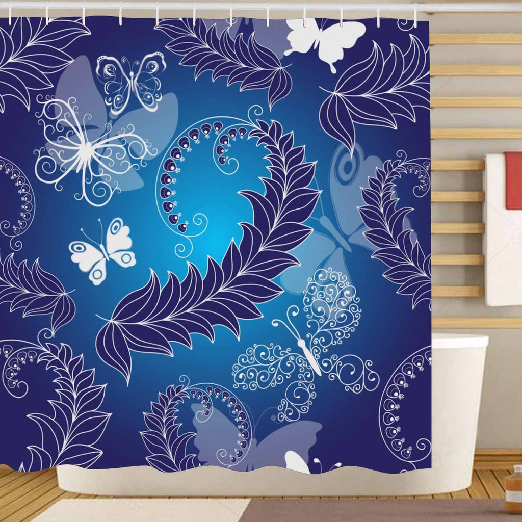 Shower Curtains print with Floral dark blue spring pattern with branch and butterflies