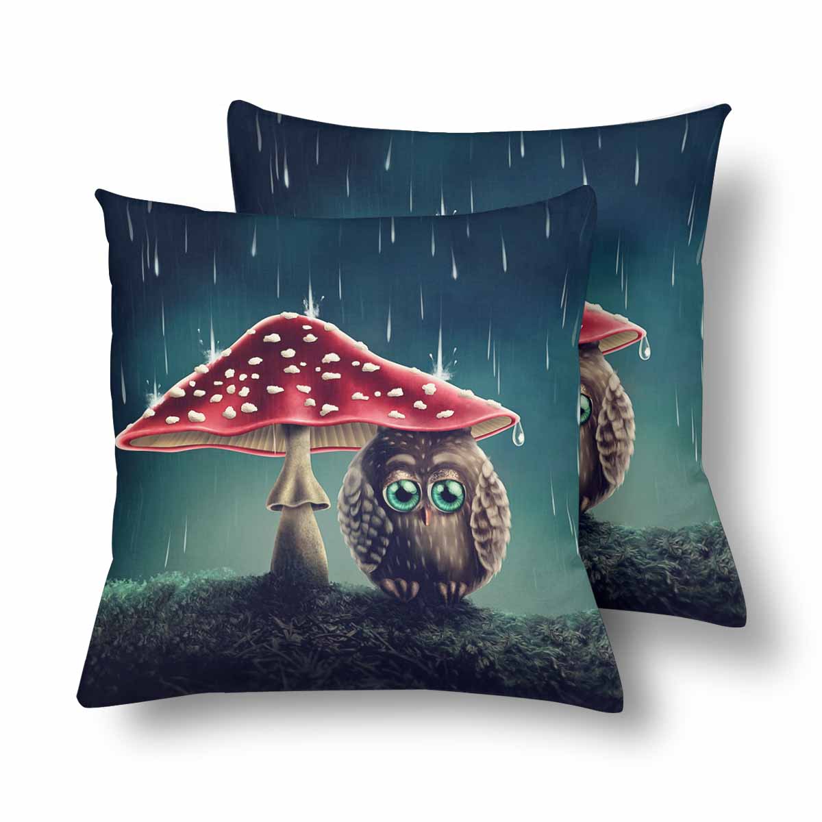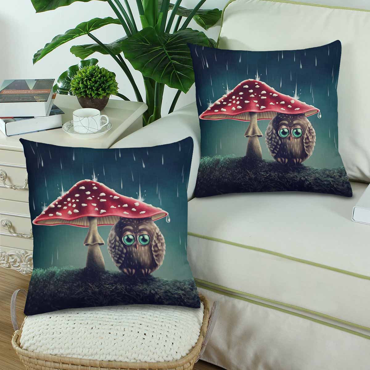 Animals themed Pillow Cases printed with Little owl sitting under mushrooms