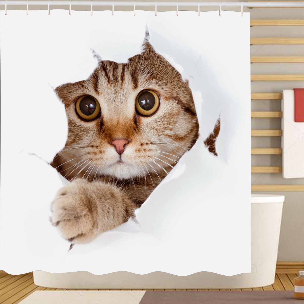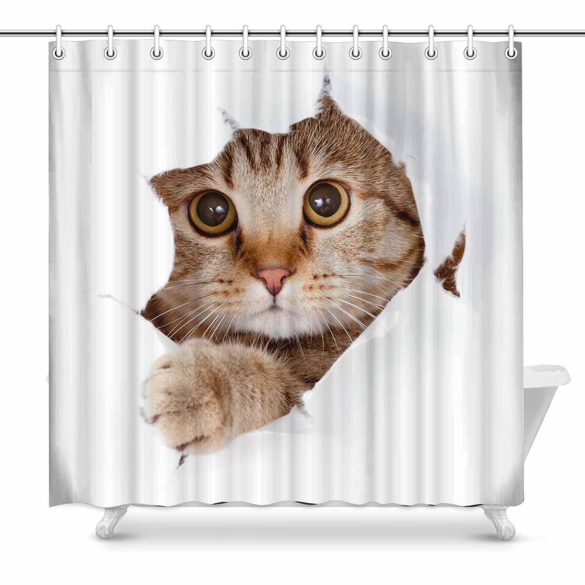 Shower Curtains print with Cat looking up in paper side torn hole isolated