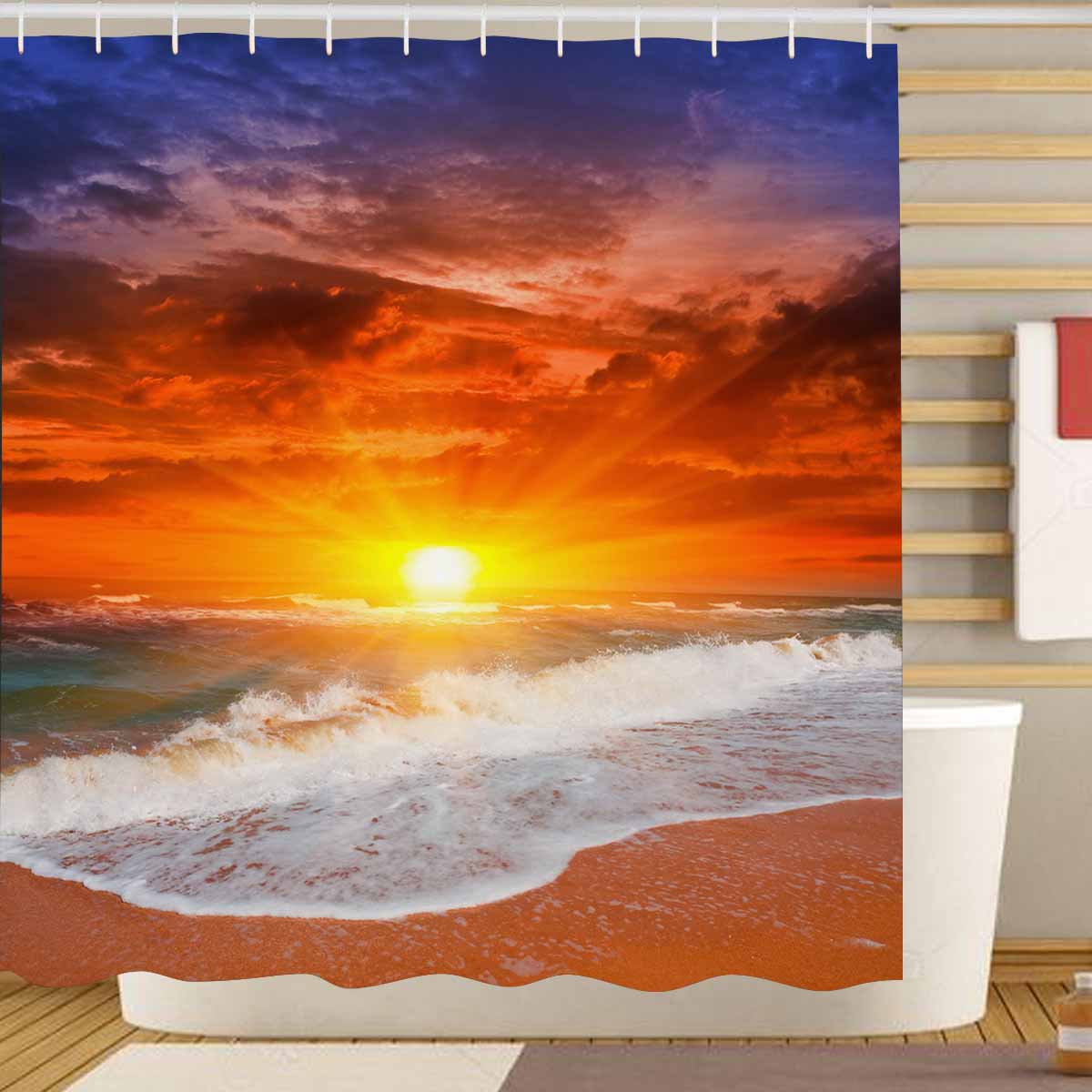 Shower Curtains print with beach Sunset on sea
