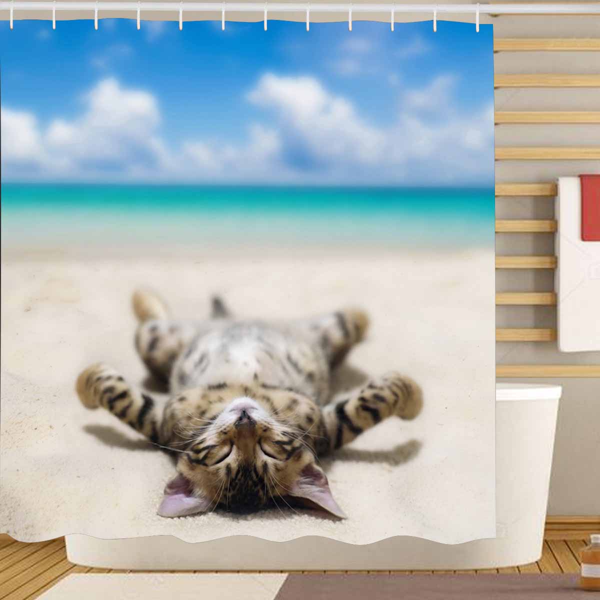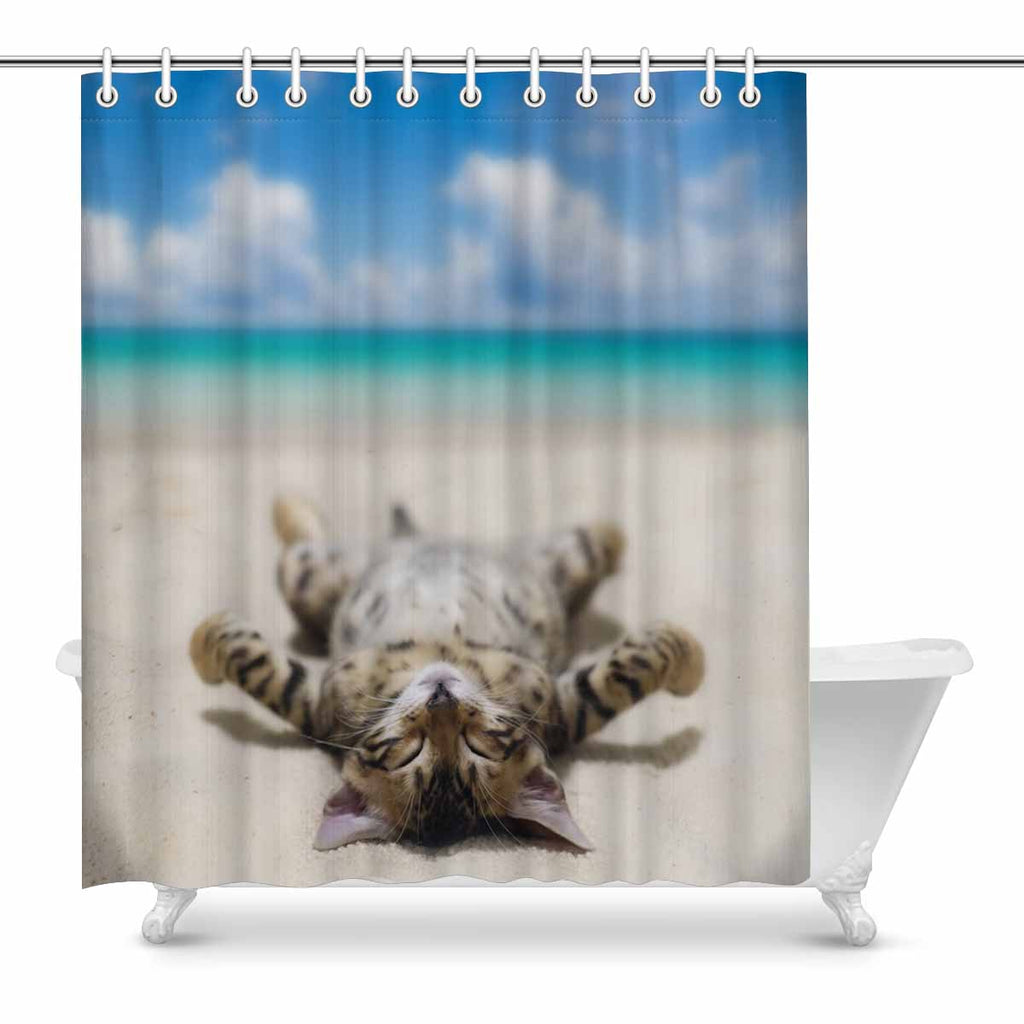 Shower Curtains print with Cat on beach