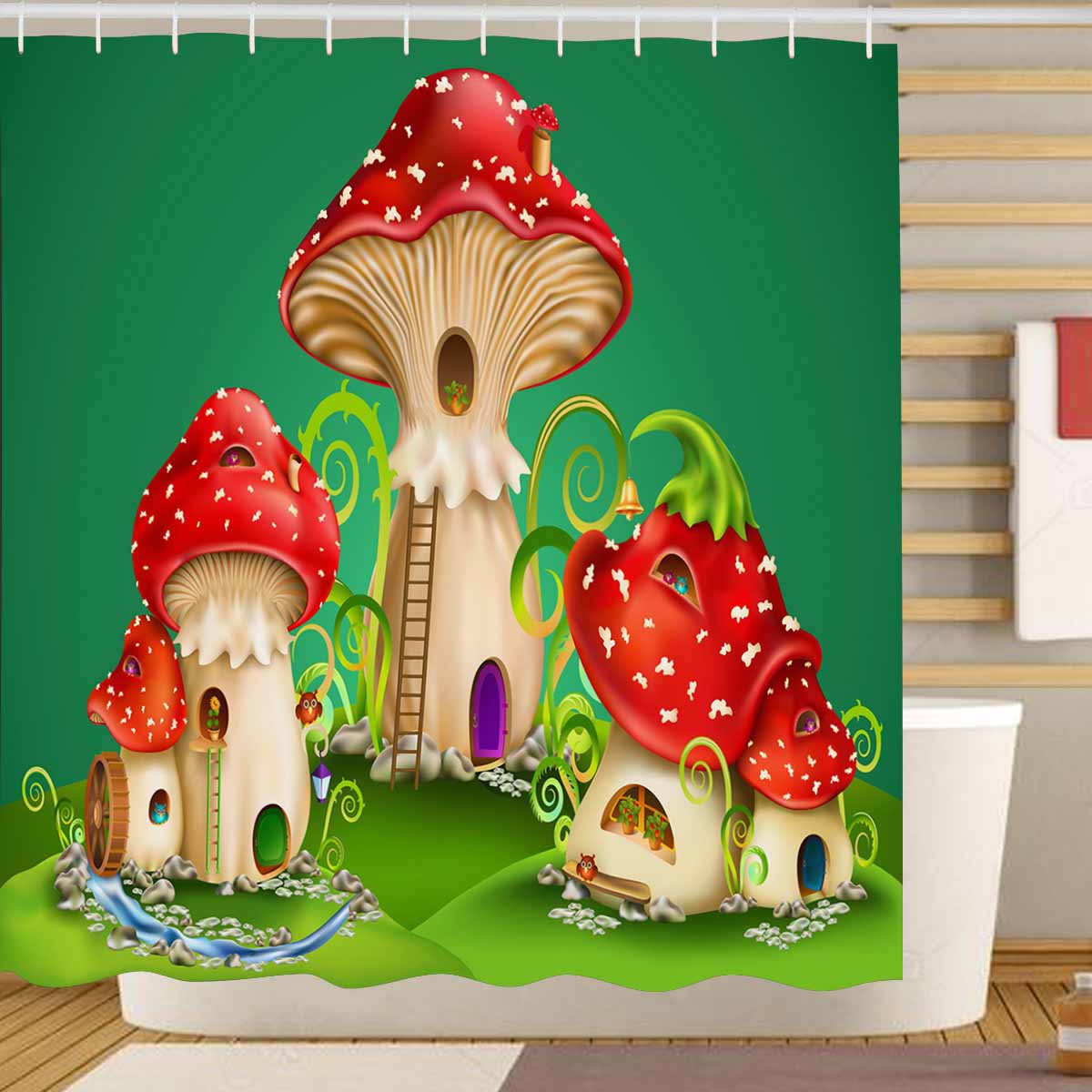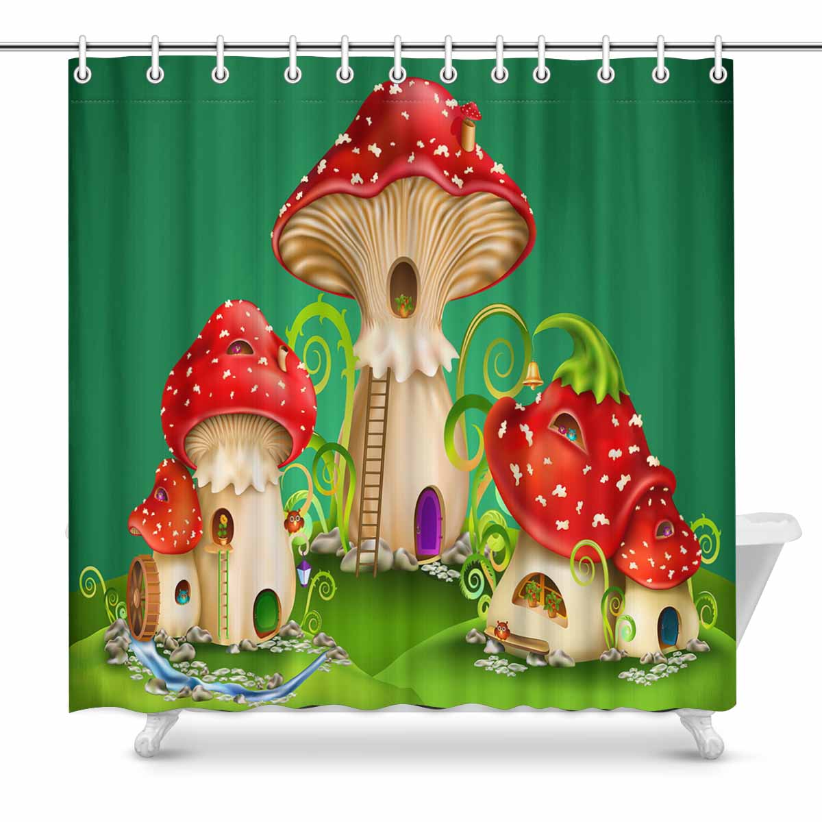 Themed for Kids Shower Curtains print with fairy houses red mushrooms with water mill golden bell and owls