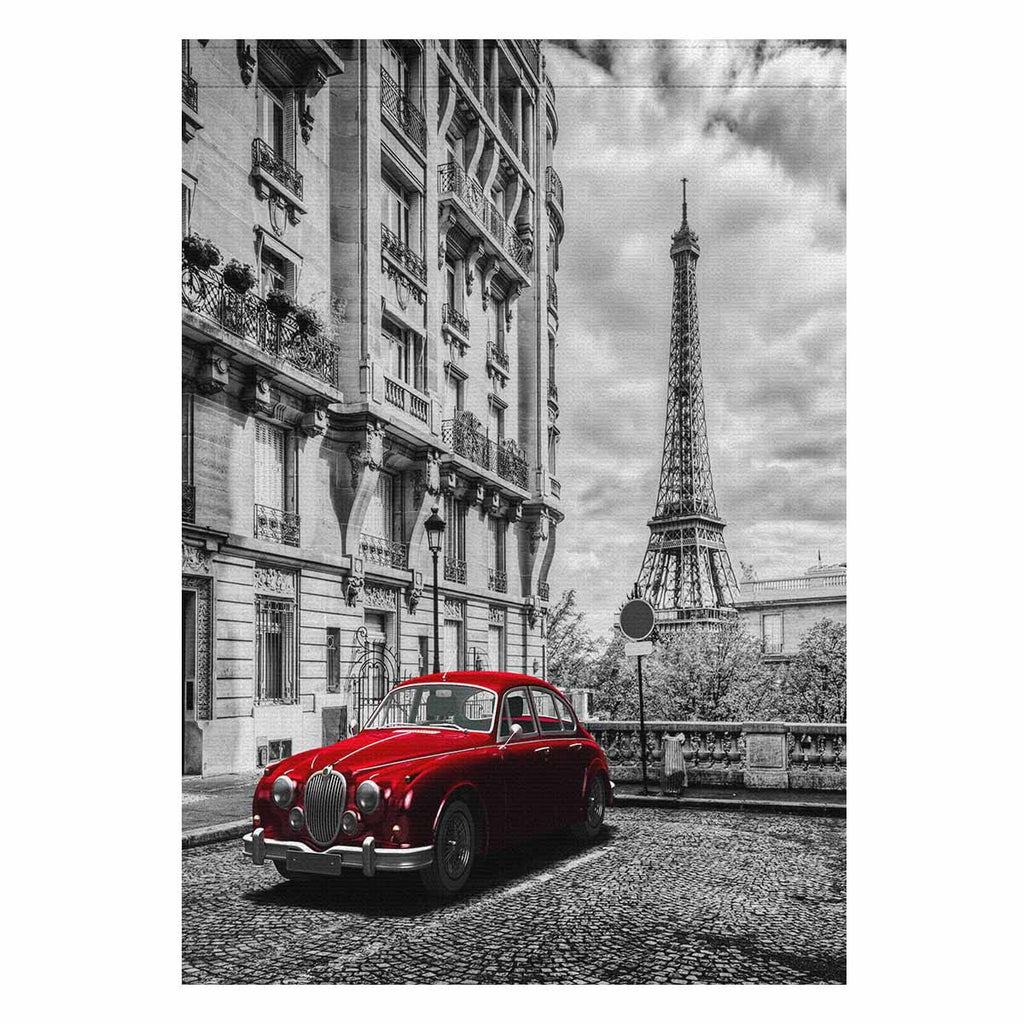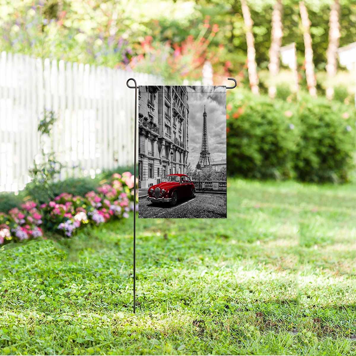 Garden Flags printed Coutry themed with Eiffel Tower seen from the street with red retro limousine car