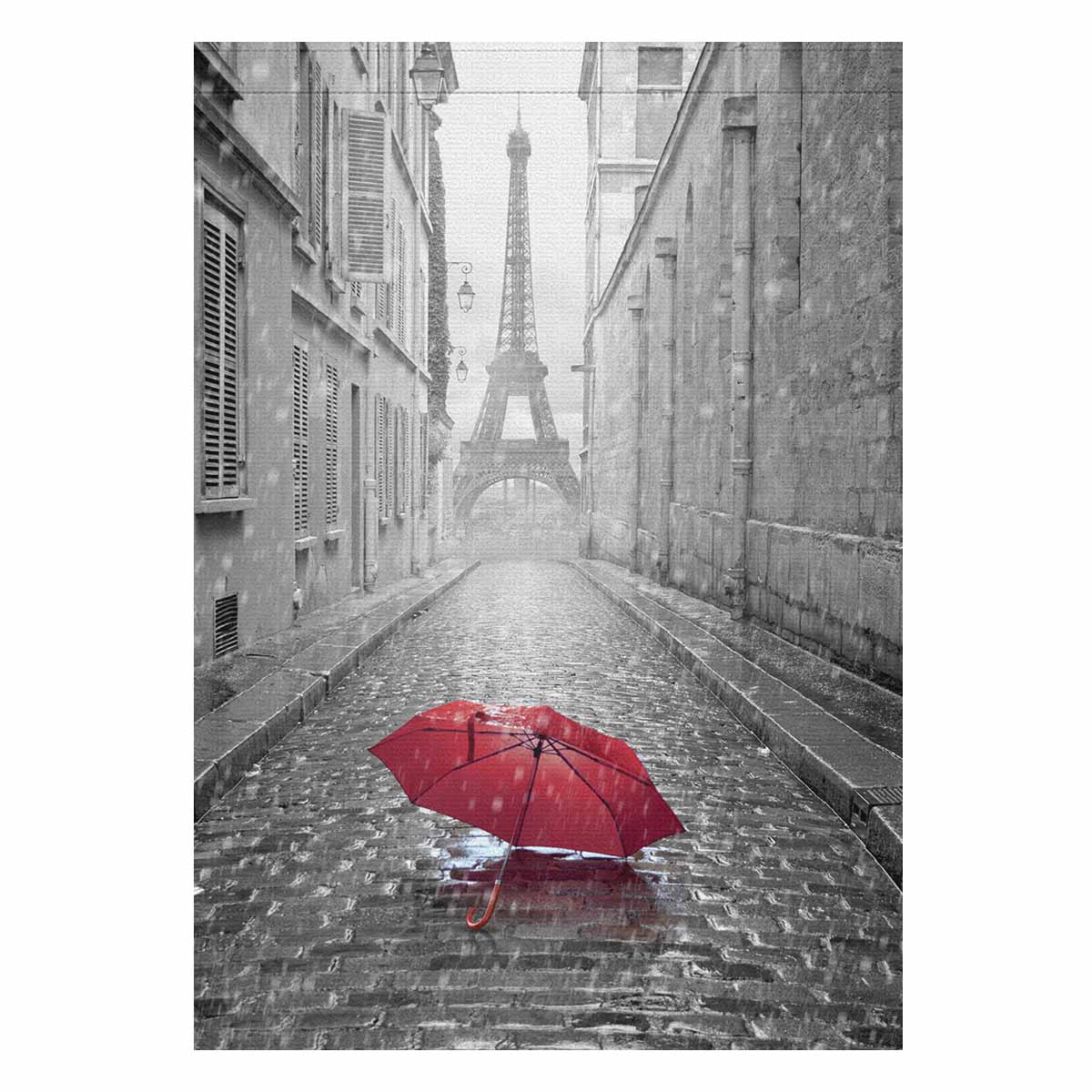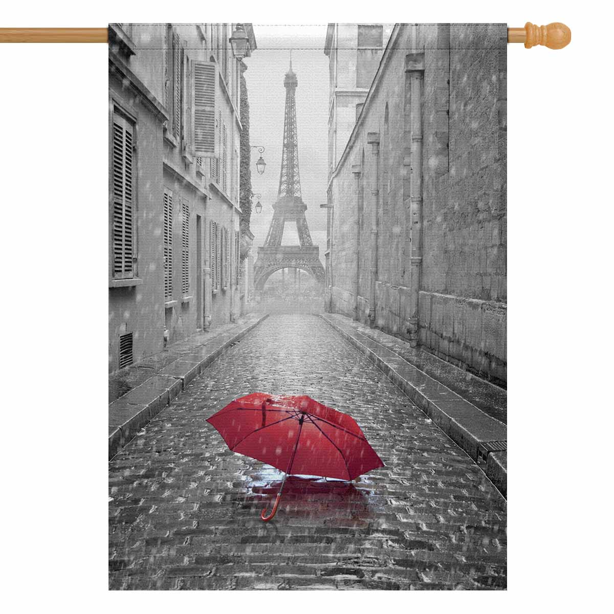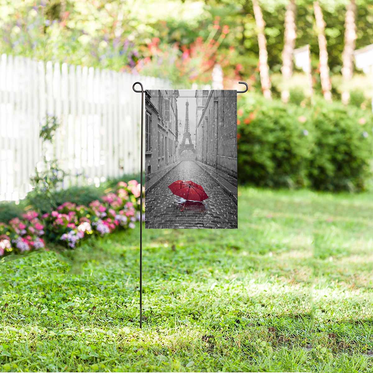 Garden Flags printed Coutry themed with Eiffel tower view from the street of Paris. Black and white photo with red umbrella.