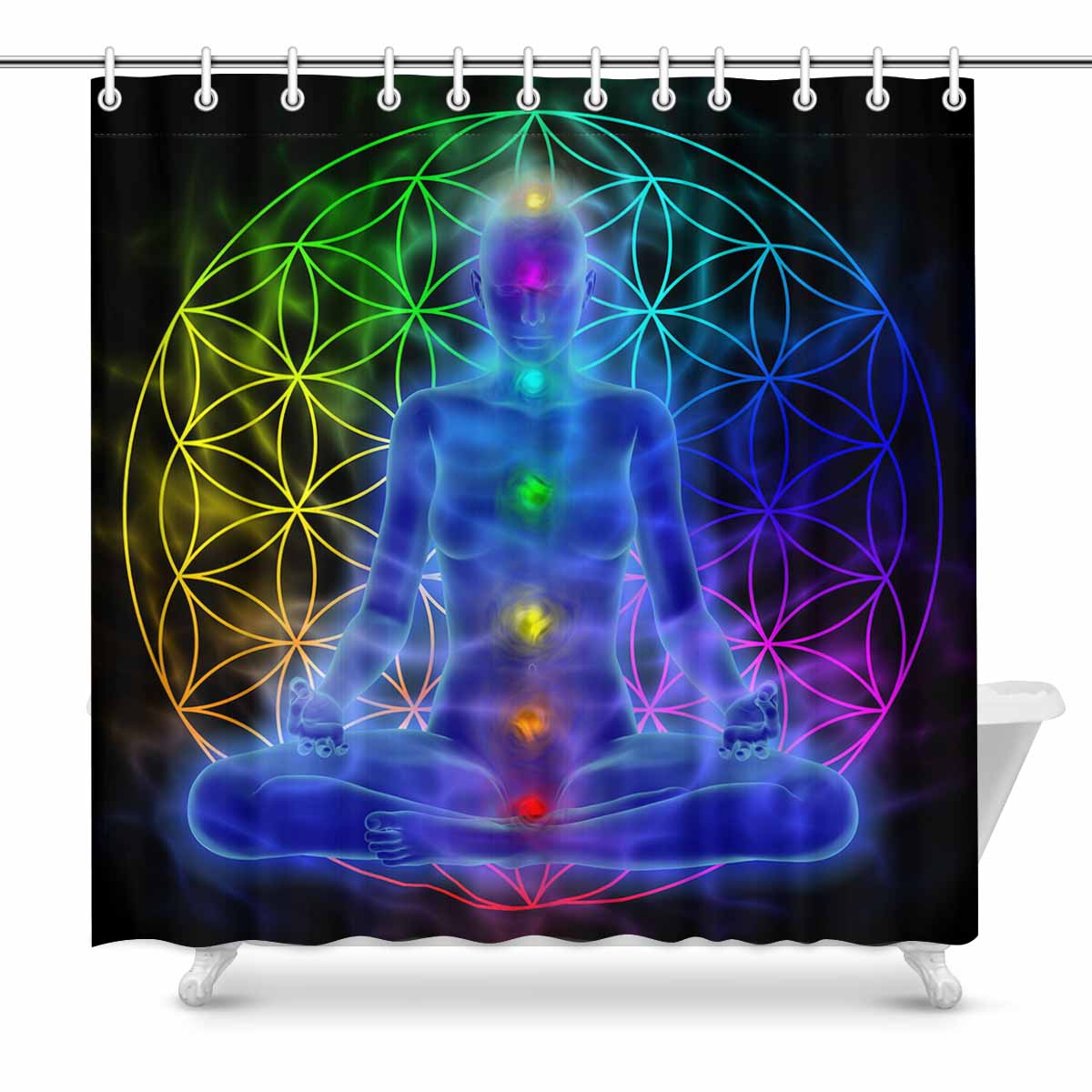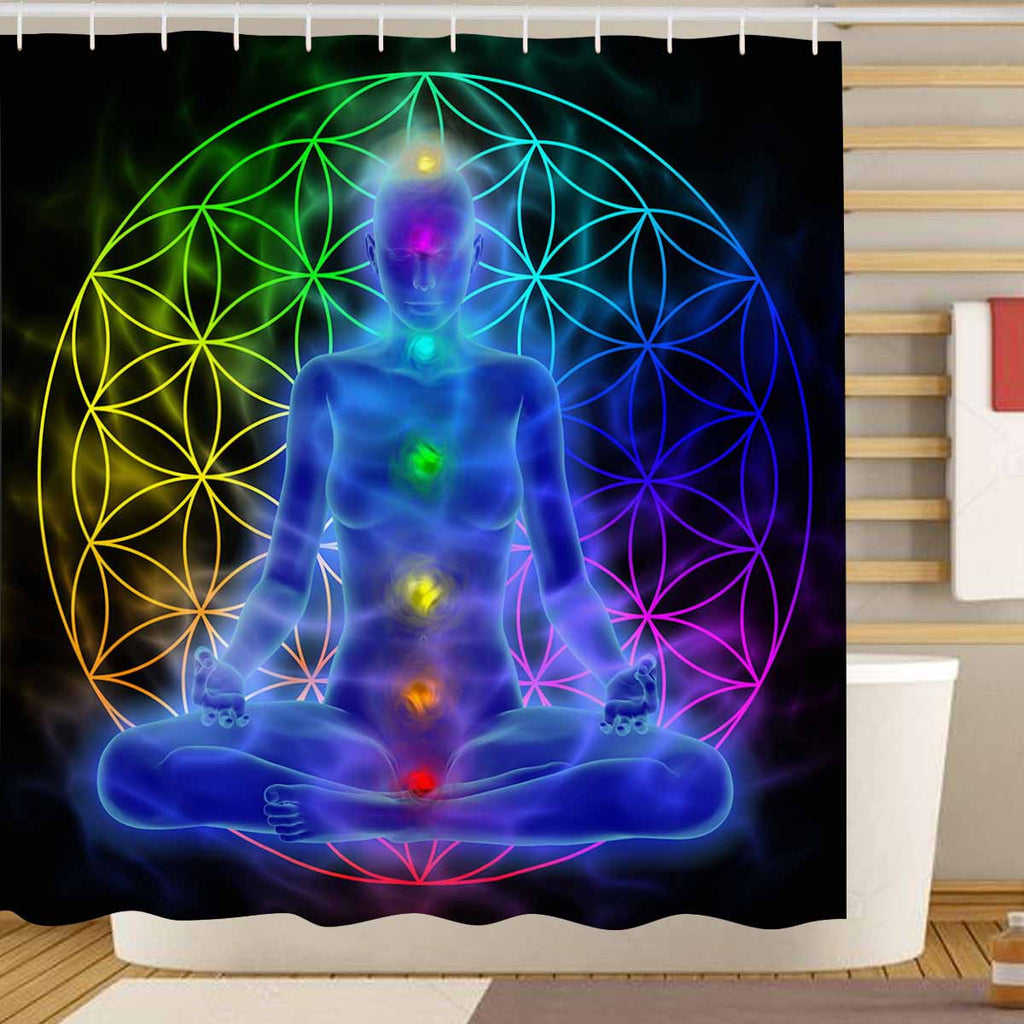 Mandala themed Shower Curtains print with Illustration of woman meditating, symbol flower of life