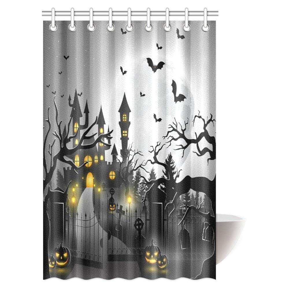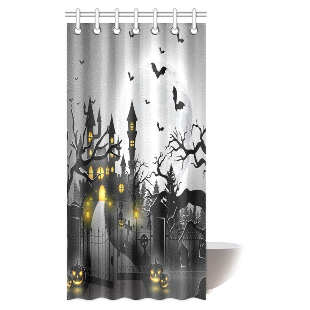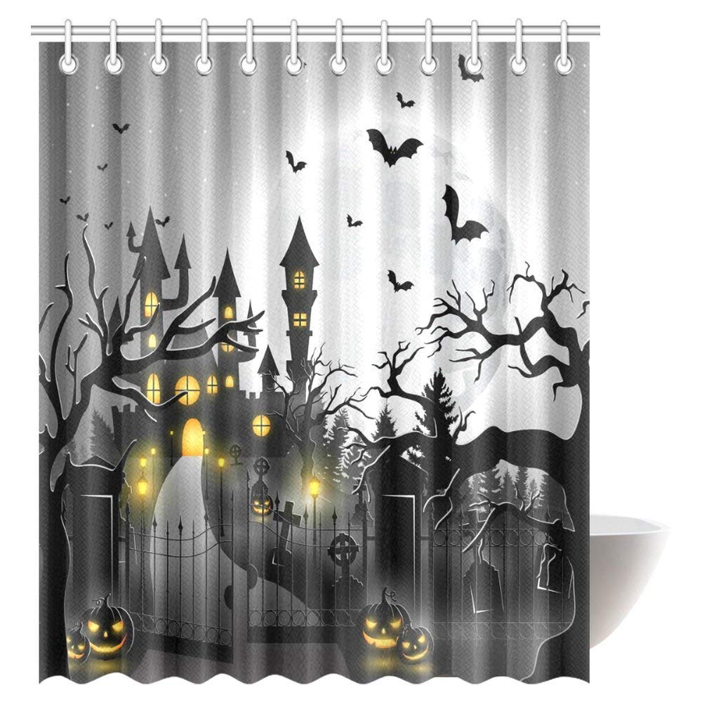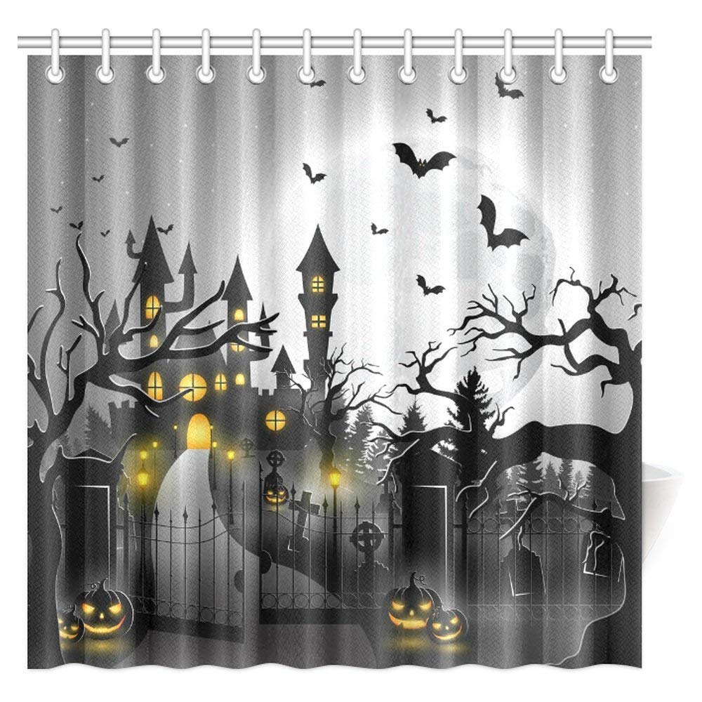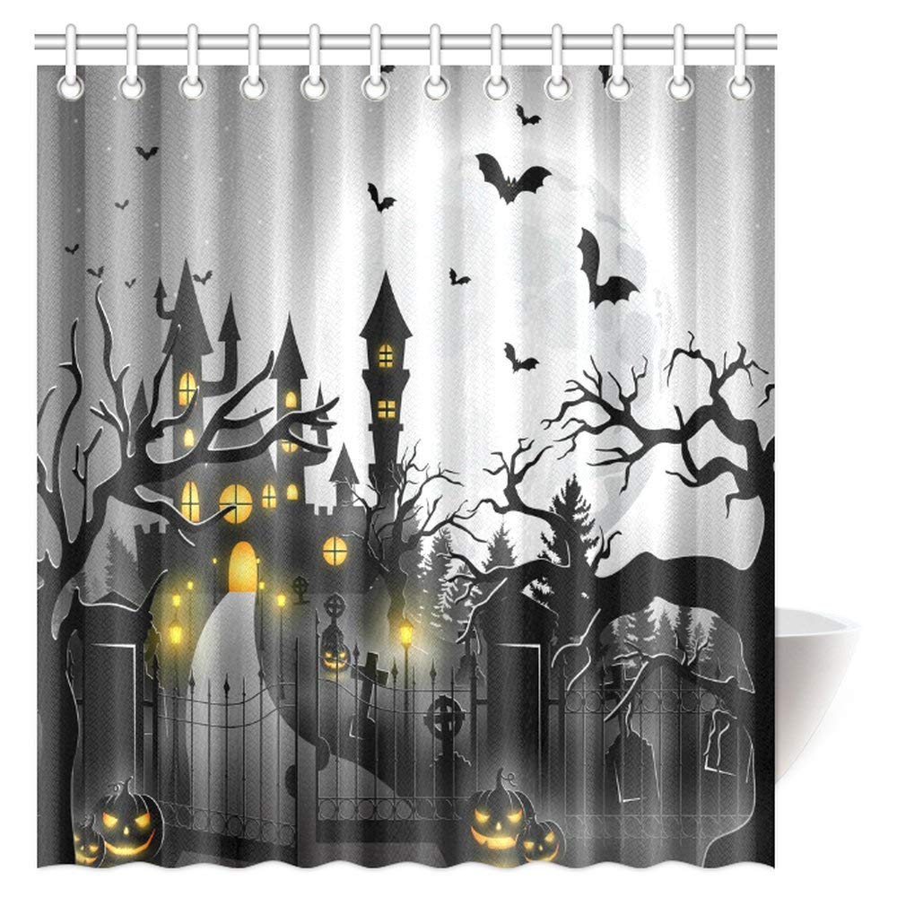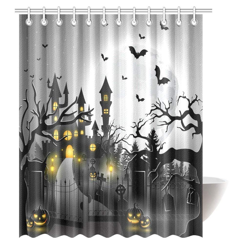 Spooky Concept with Halloween Icons Shower Curtain, Creepy Graveyard with Castle and Pumpkins Bathroom Shower Curtain with Hooks