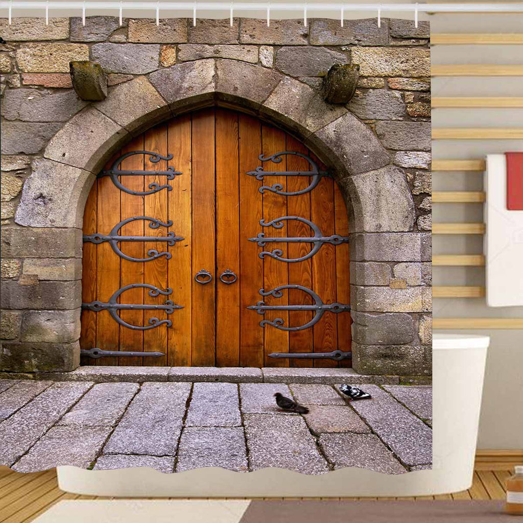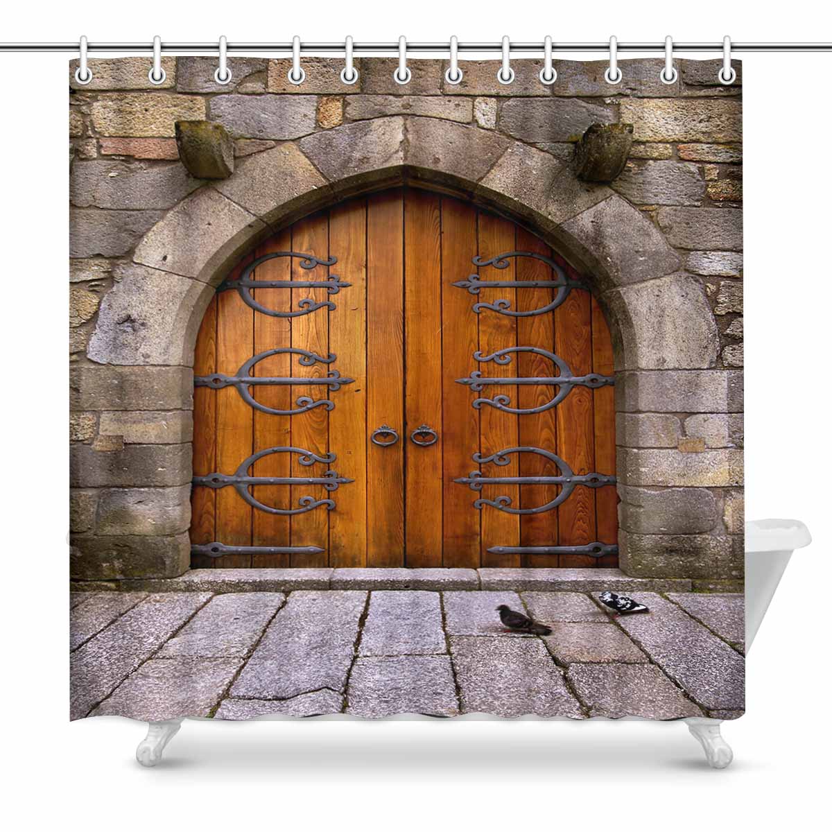 Rustic themed Shower Curtains print with old wooden door with iron ornaments in a medieval castle