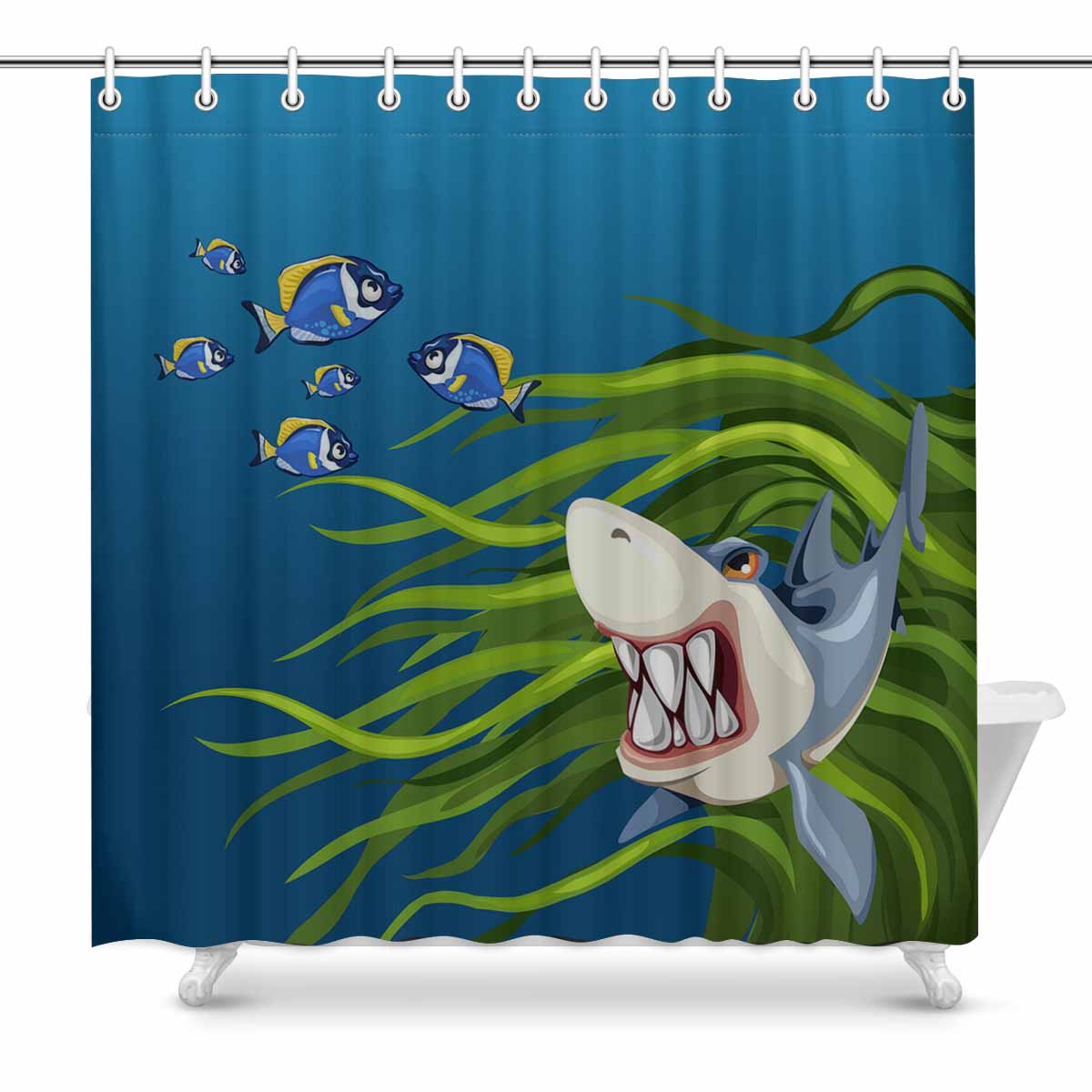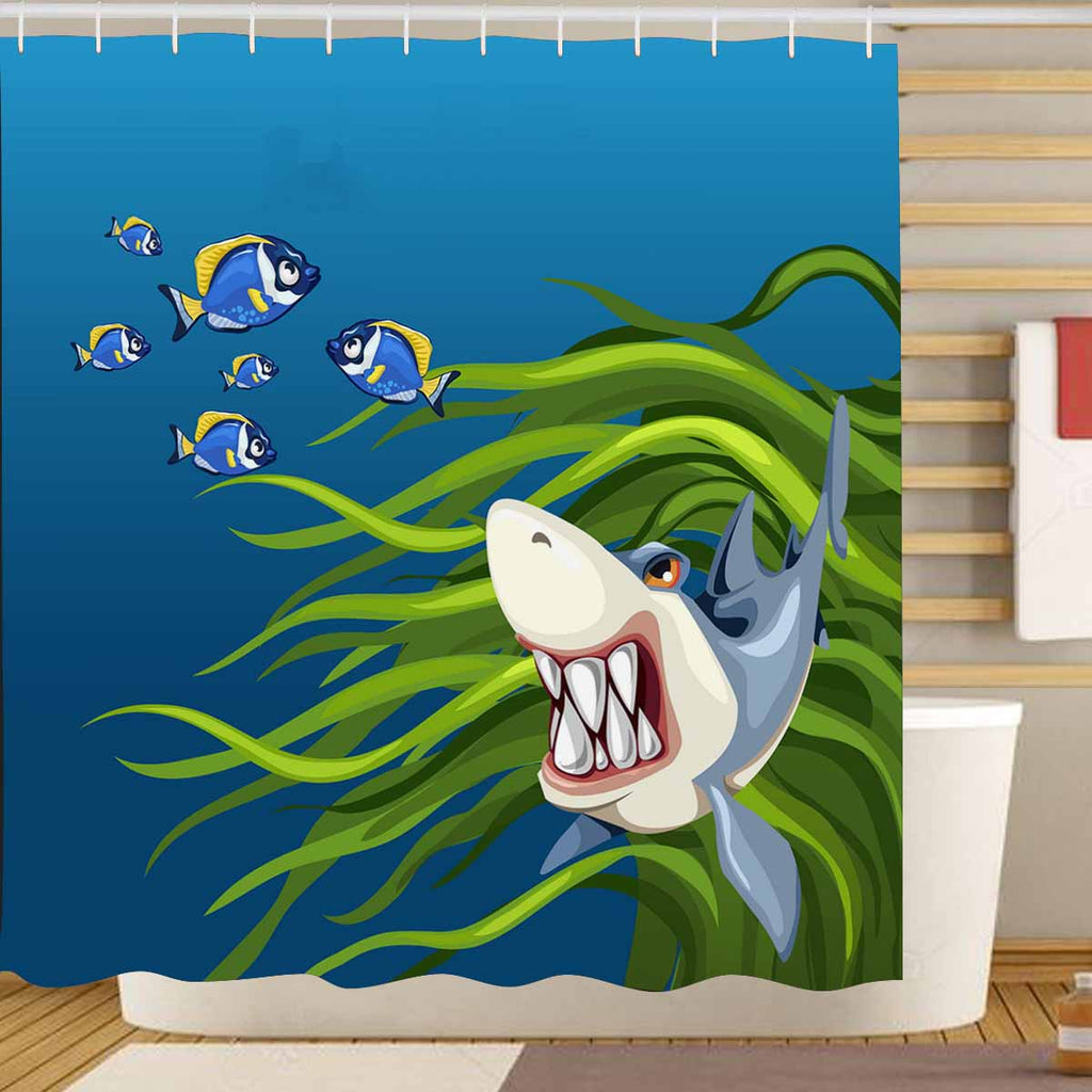 Seaworld Shower Curtains print with Angry shark among algae