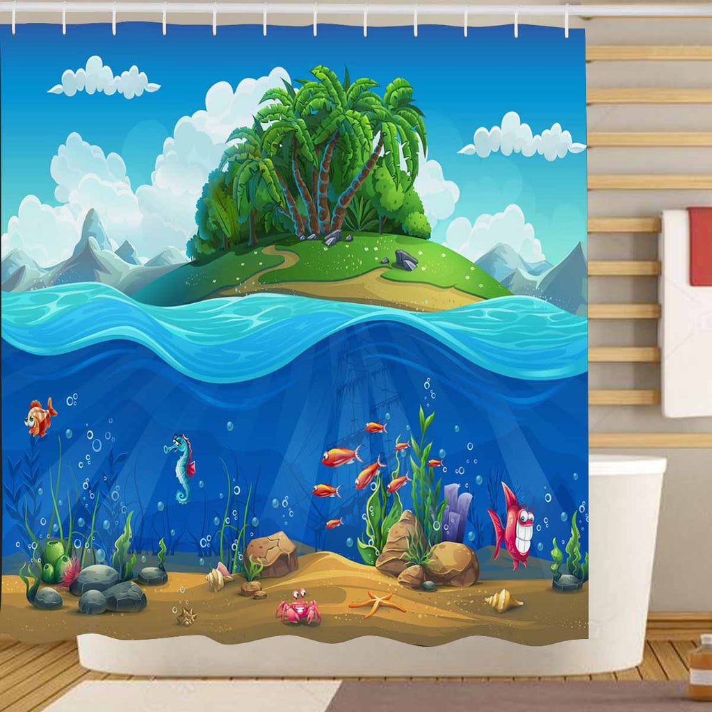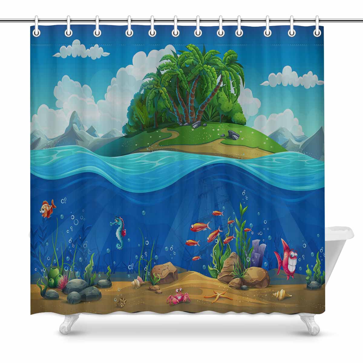 Seaworld Shower Curtains print with Cartoon fish plants island