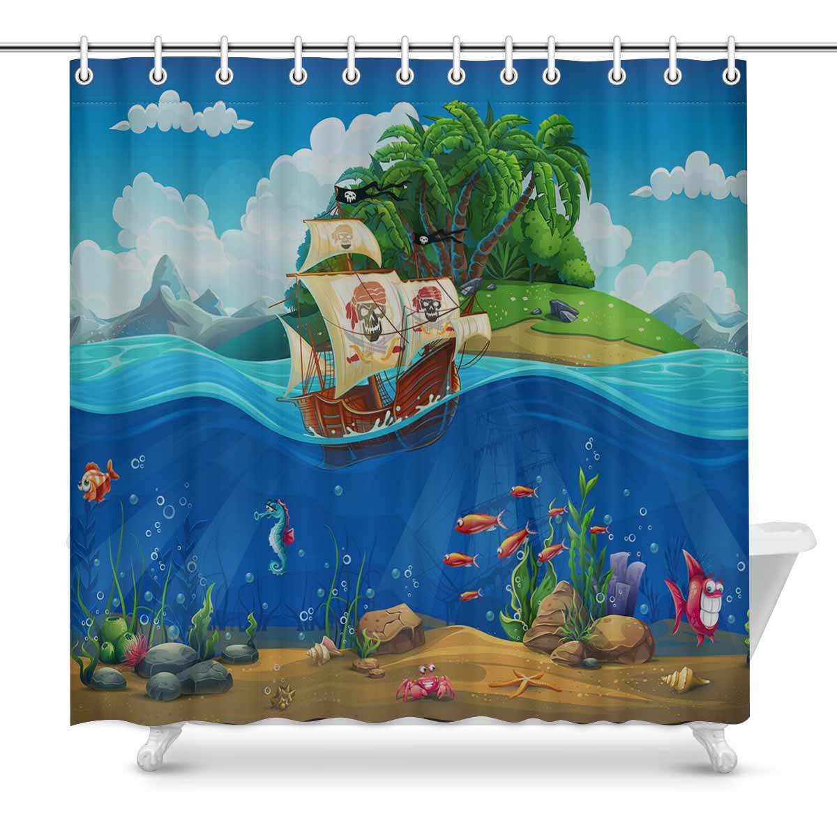 Seaworld Shower Curtains print with fish plants island and ship