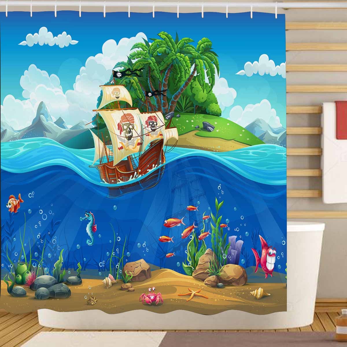 Seaworld themed print on shower curtains for bathroom, create a brilliant atmosphere in your bathroom, include a selection of different stylish and custom-made designs for your bath decoration.