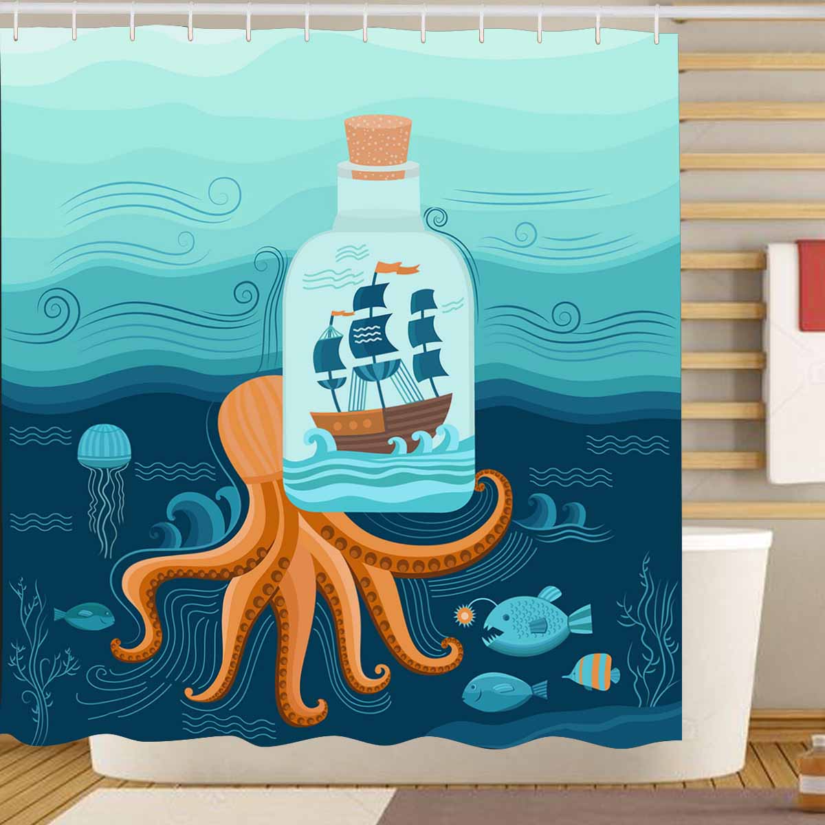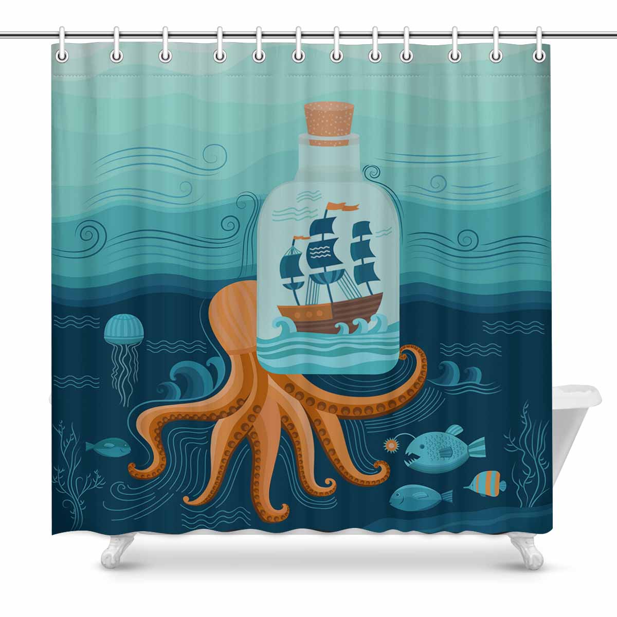 Seaworld Shower Curtains print with octopus with Ship in the Bottle