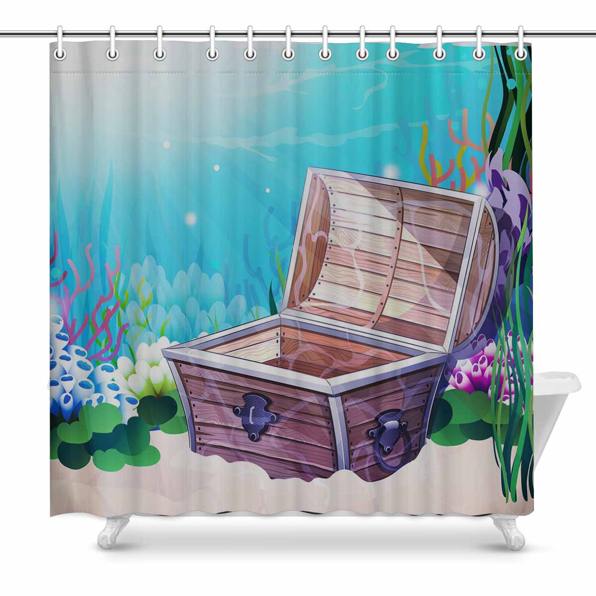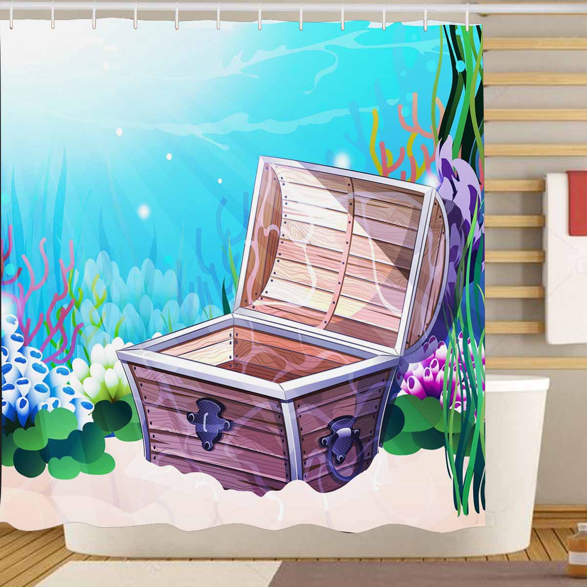 Seaworld Shower Curtains print with Sea bottom with old chest