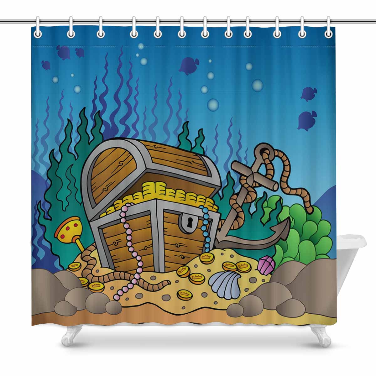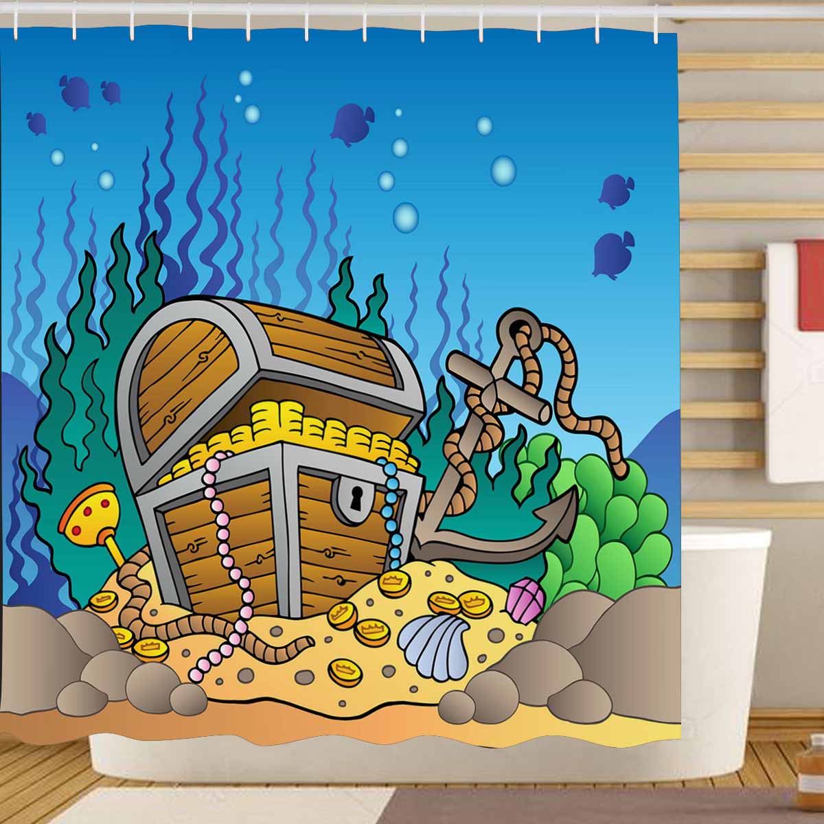 Seaworld Shower Curtains print with Sea bottom with old treasure chest