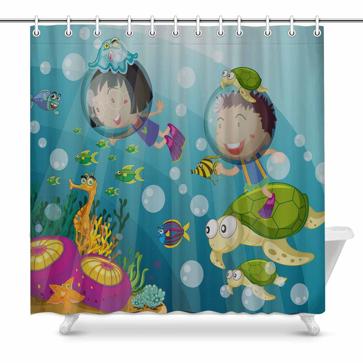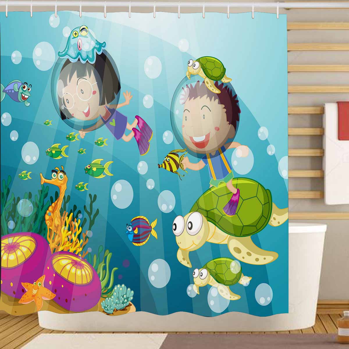 Seaworld Shower Curtains print with tortoise and kids in deep water