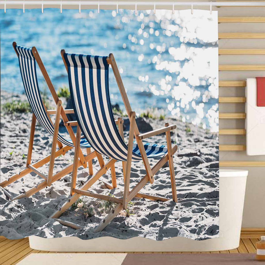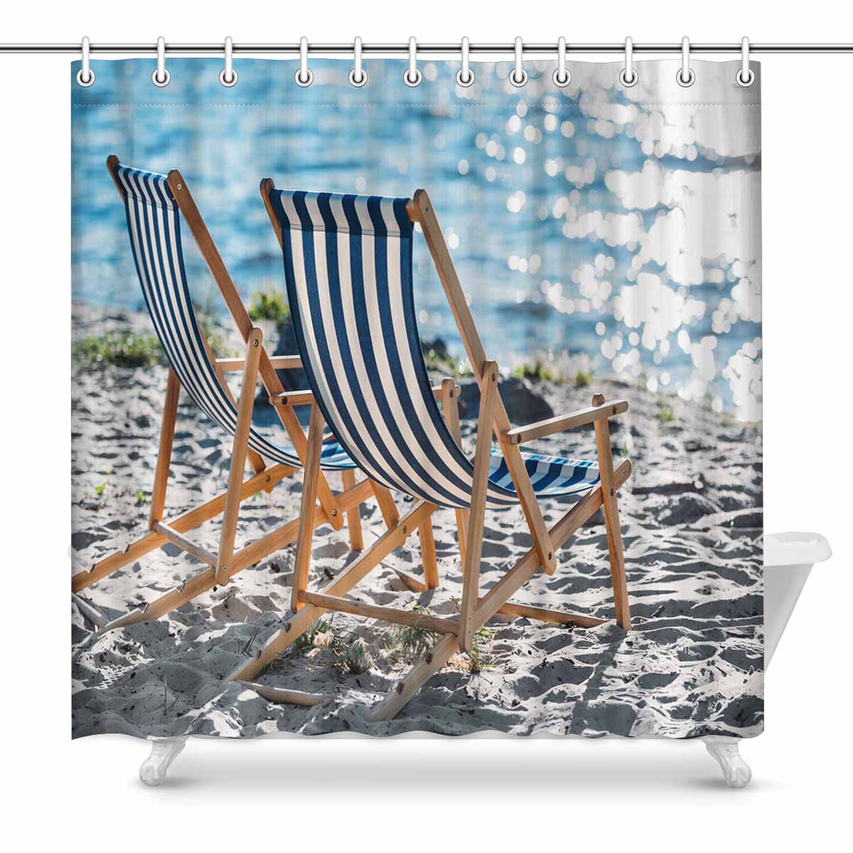 Tropical themed Shower Curtains Striped chaise lounges and cooler on sandy beach